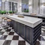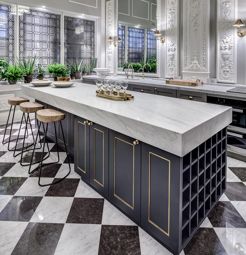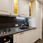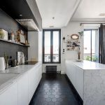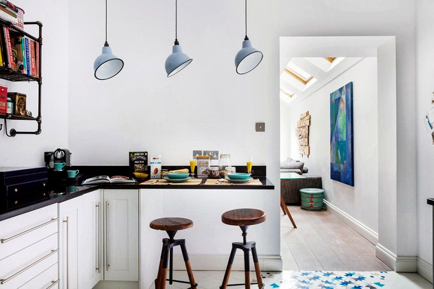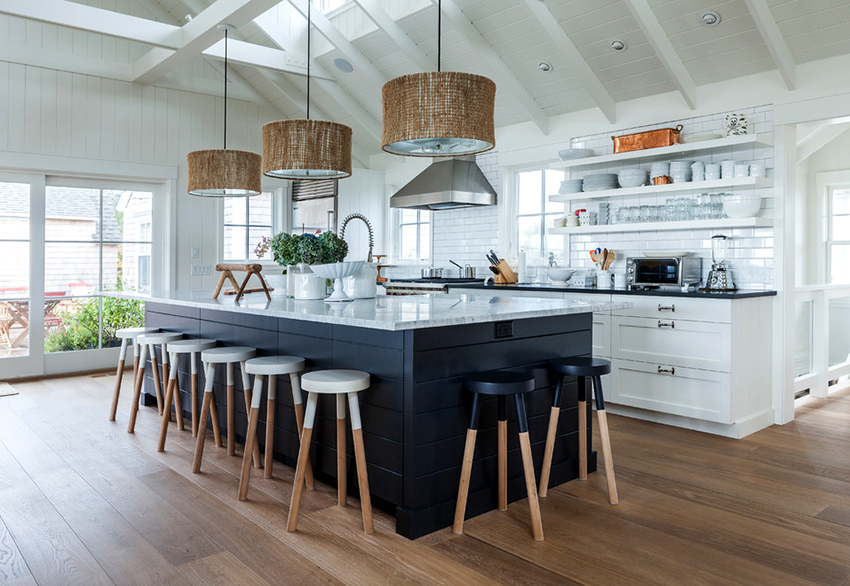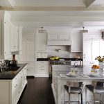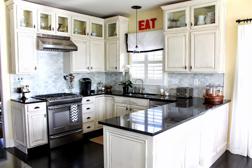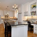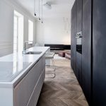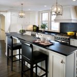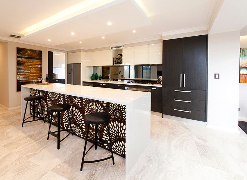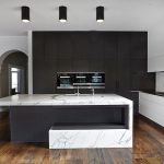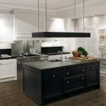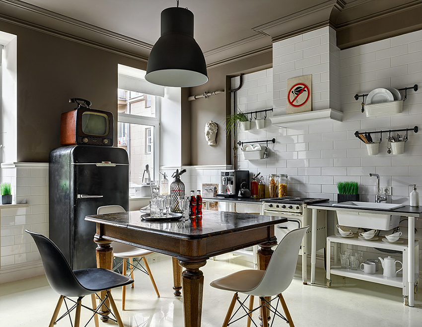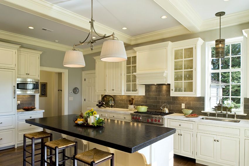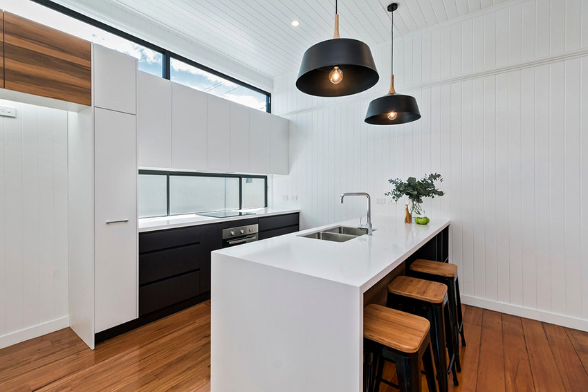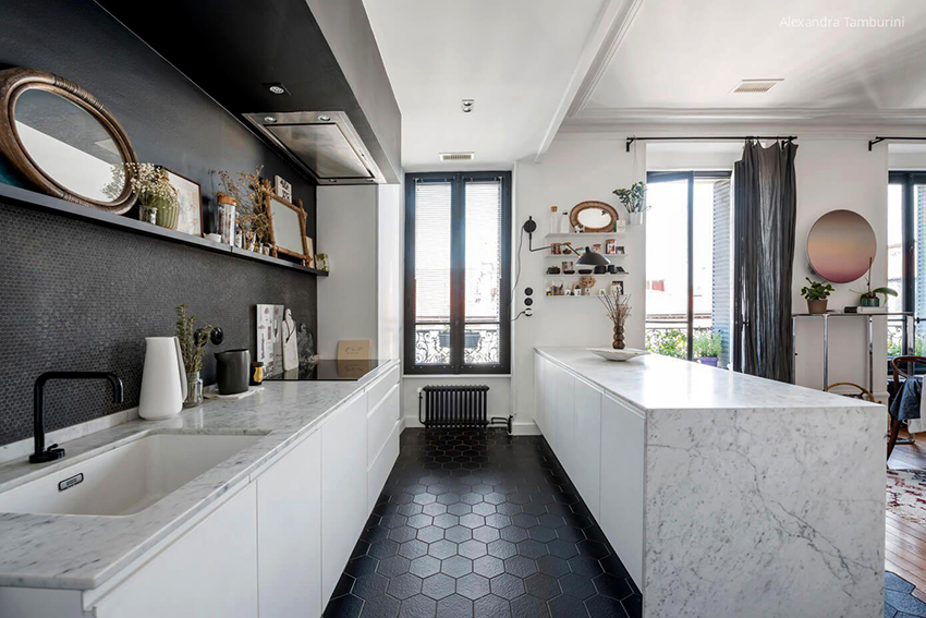 Gabungan dapur putih dan meja hitam kelihatan paling menguntungkan dalam gaya klasik moden