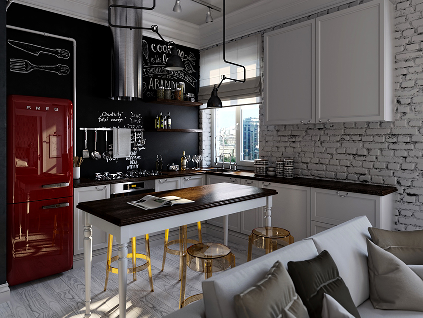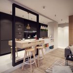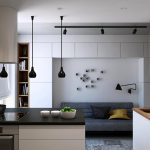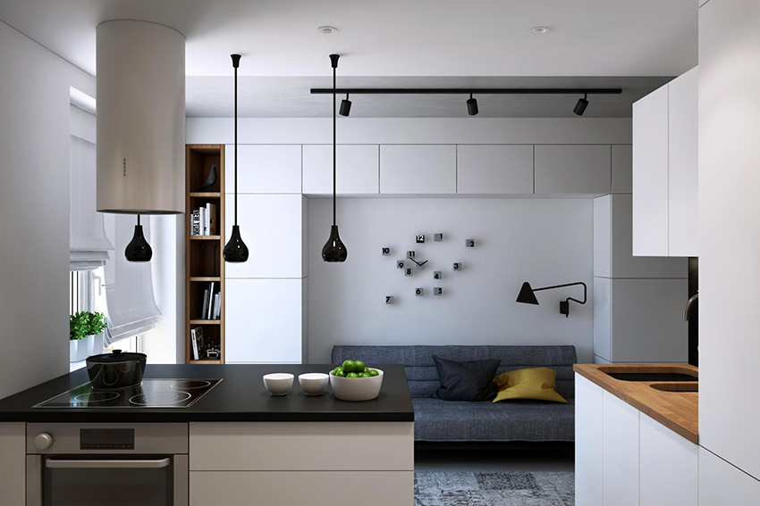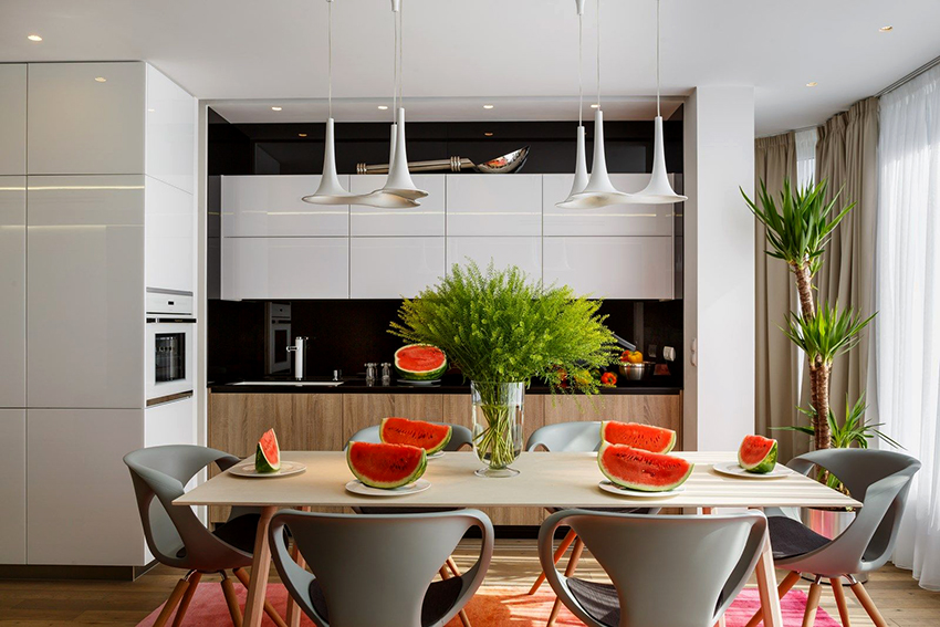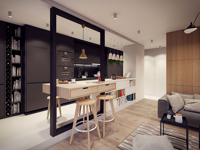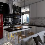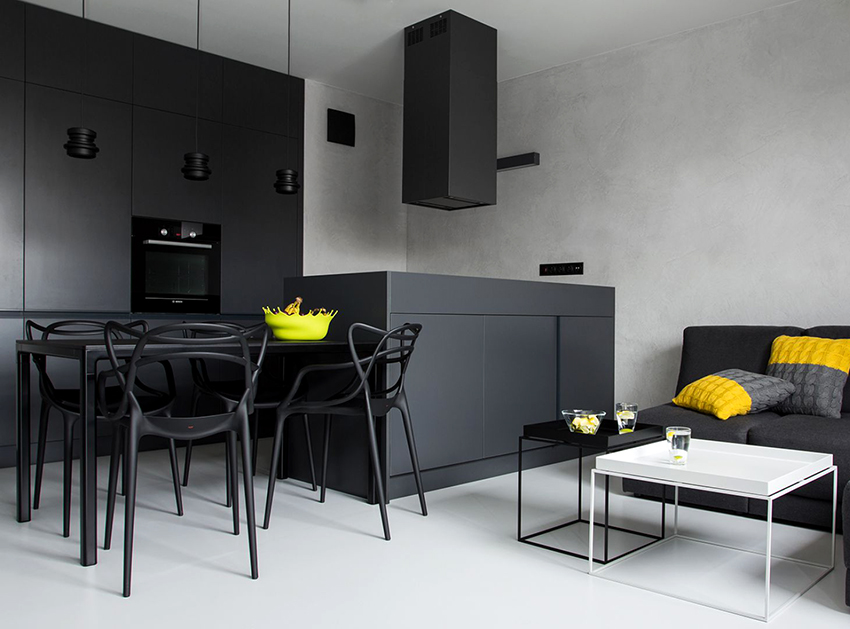 Bukan tanpa sebab bahawa pereka sering memilih perabot hitam untuk membuat bahagian dalam pangsapuri studio, di mana dapur digabungkan dengan ruang makan dan ruang tamu. Ruang tamu dapur hitam dan putih dengan aksen menarik kelihatan sangat bergaya.