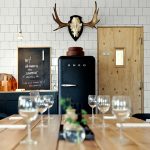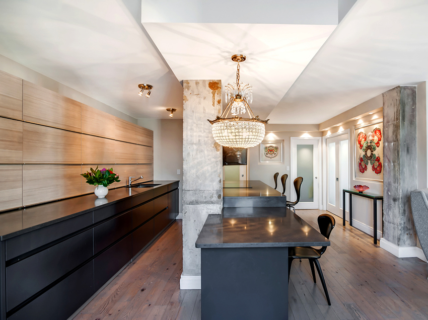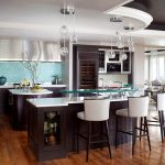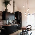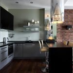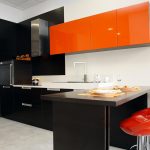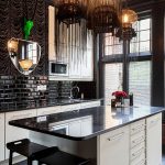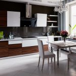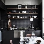 Bagaimanapun, perkara utama adalah tidak keterlaluan, kerana dengan latar belakang hitam semua warna akan kelihatan jauh lebih cerah dan lebih kaya. Oleh itu, tidak digalakkan memuatkan reka bentuk laconic dengan aksesori dan warna yang menarik. Beberapa butiran dalam bentuk cerek elektrik, pinggan mangkuk atau candelier akan mencukupi.