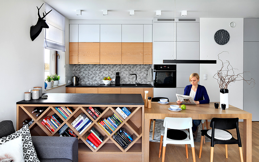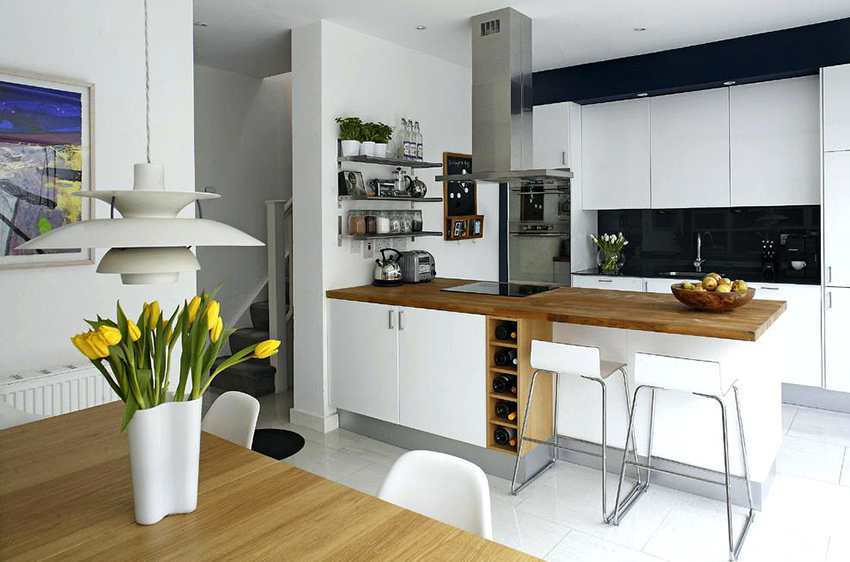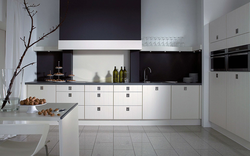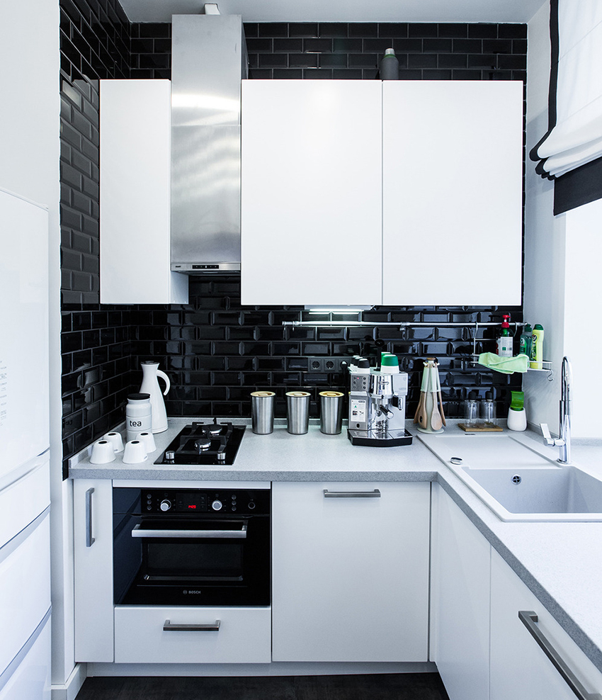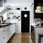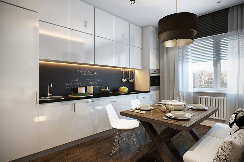 Kedudukan putih akan membantu meluaskan ruang dapur, yang sangat penting untuk dapur kecil. Kelimpahan warna hitam akan menambahkan misteri, kesungguhan dan sikap berjimat cermat di dalam bilik. Penguasaannya dapat diterima di dapur yang luas. Pilihan reka bentuk yang optimum untuk dapur putih dan hitam adalah sebaran berkadar dua nada yang berbeza, yang dapat dinyatakan sebagai berikut: