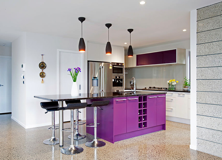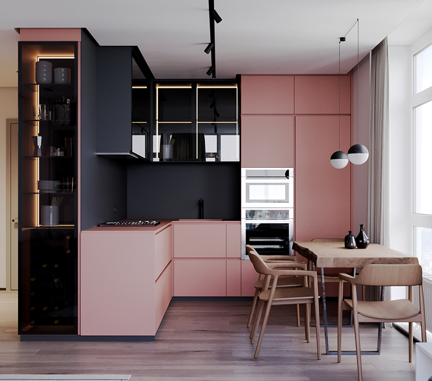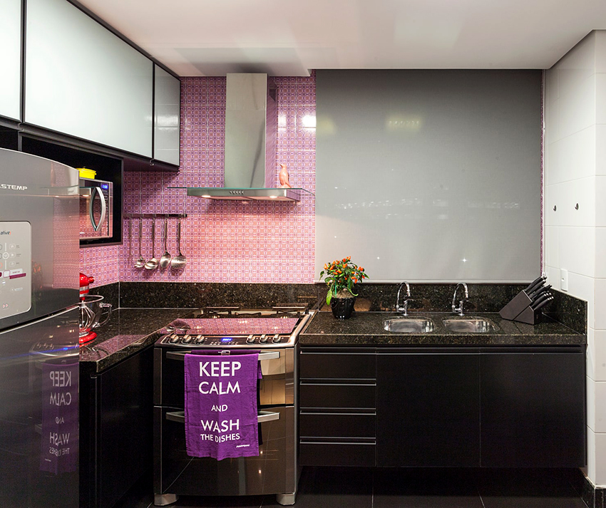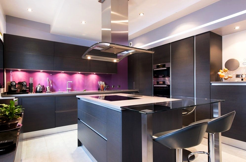 Apabila dapur didasarkan pada set hitam, perkara utama adalah jangan keliru dengan warna latar belakang. Pilihan terbaik adalah menggunakan warna cahaya kontras yang menekankan kesederhanaan, kecanggihan dan kedalaman perabot hitam, yang diberi peranan utama. Tambahan terang pada kemasan cahaya boleh menjadi unsur aksen berwarna merah atau ungu.