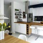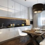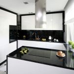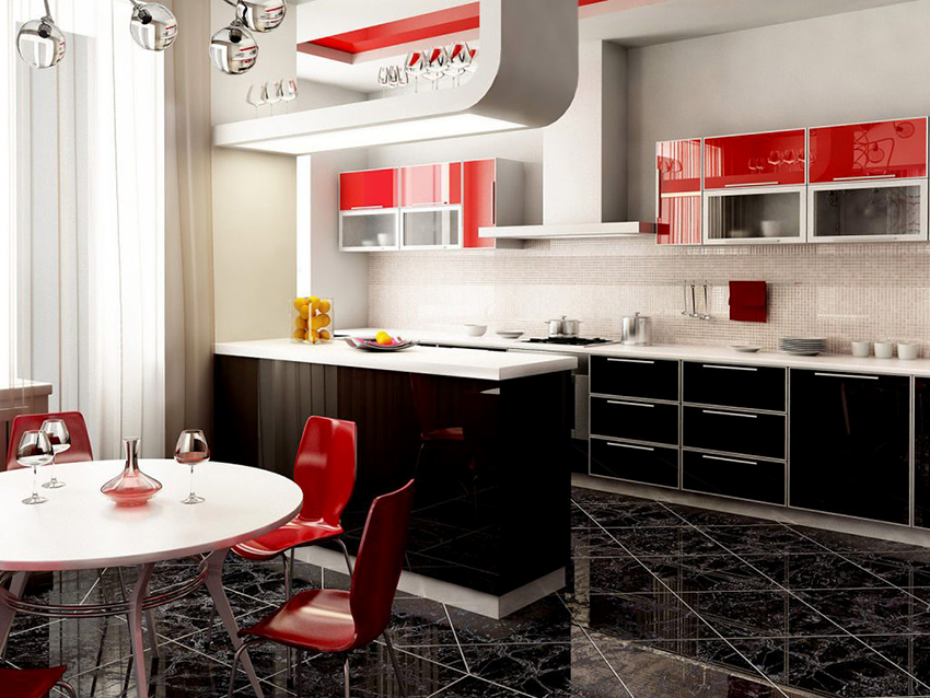 Sekiranya pilihan dibuat sesuai dengan klasik, maka ruangan itu harus mengandungi perabot yang elegan dengan ukiran dan hiasan dalam bentuk cetakan. Lantai batu hitam semula jadi atau tiruan sangat sesuai. Bahagian dalaman berteknologi tinggi, yang progresif dan berfungsi, mempunyai garis yang jelas, dan gabungan warna hitam dan putih yang kontras menekankan gaya. Lebih baik melengkapkan meja hitam dapur putih dalam reka bentuk ini dengan kilauan logam peralatan rumah tangga.