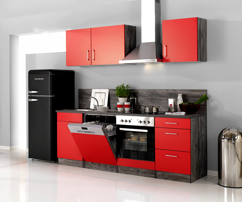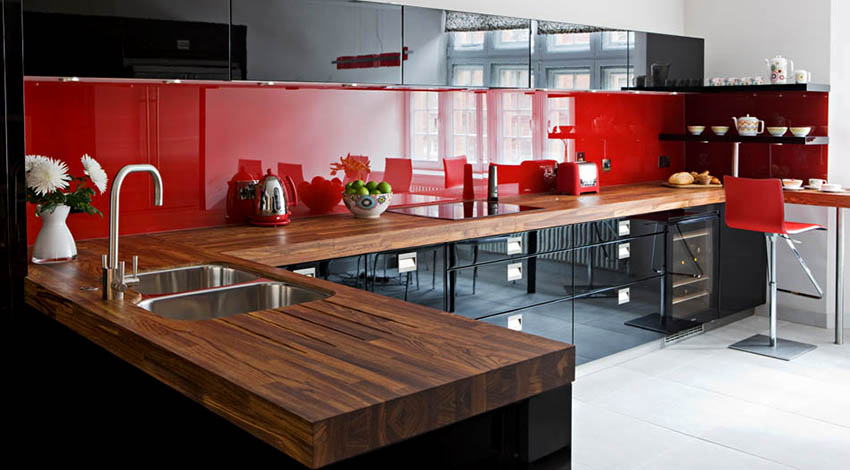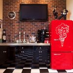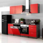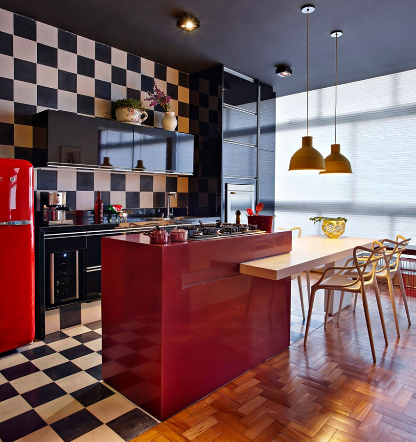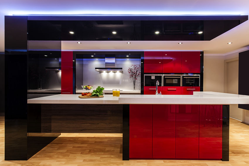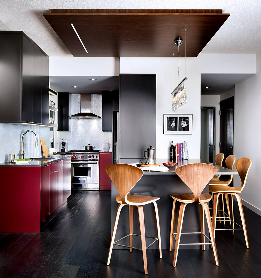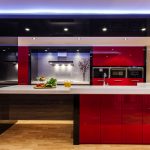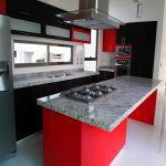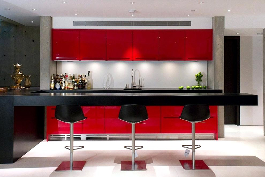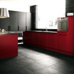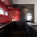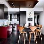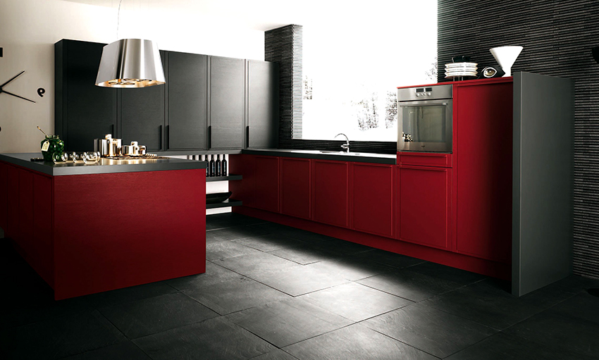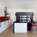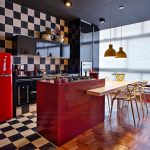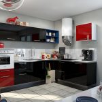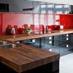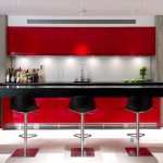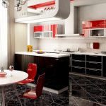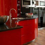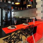 Dapur dengan warna merah dan hitam tidak boleh disebut biasa. Reka bentuk ini adalah pilihan personaliti pencinta kebebasan dan luar biasa yang mengikuti fesyen. Untuk membuat reka bentuk yang berjaya dalam warna-warna ini, anda mesti memilih warna yang dominan terlebih dahulu. Selalunya berwarna merah, dan kesannya yang bergaya dan dramatik secara berkesan ditekankan oleh warna hitam, memberikan dalaman kecanggihan dan eksklusif tambahan.