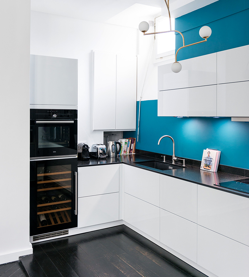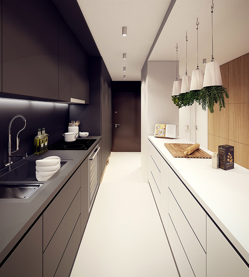 Dapur putih dengan meja kerja hitam: gabungan yang berlawanan