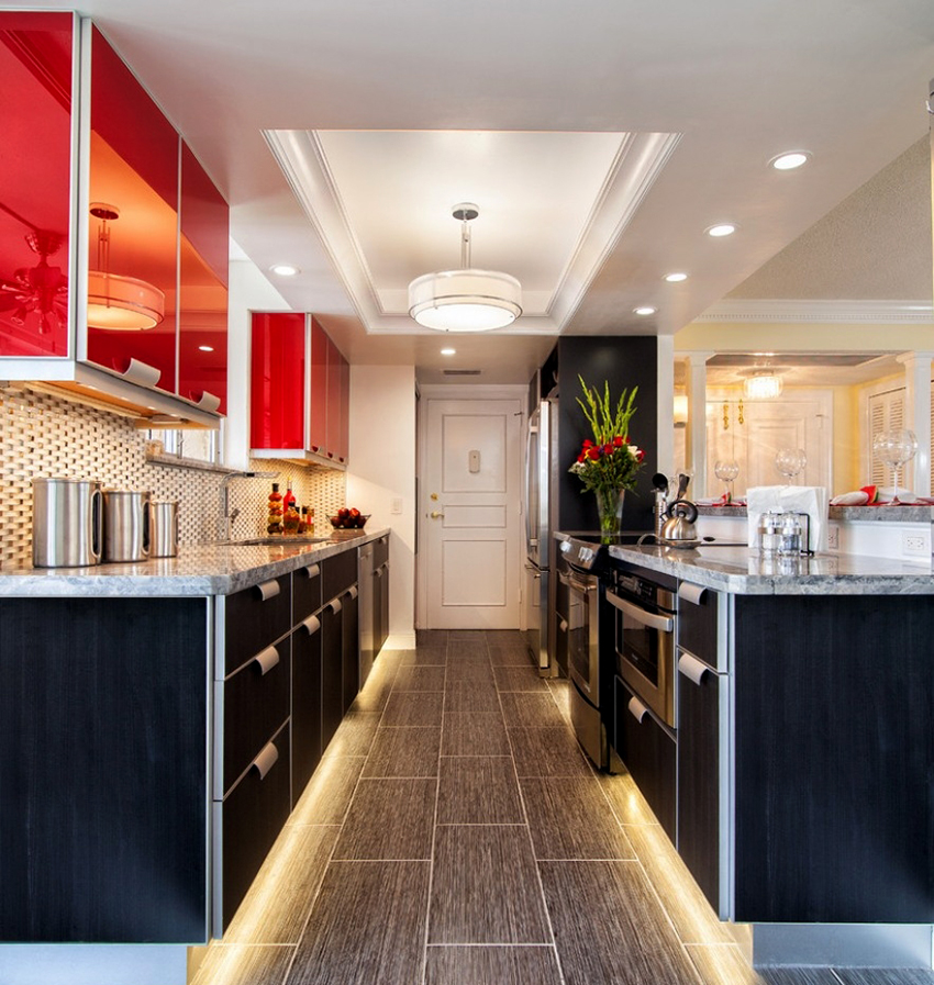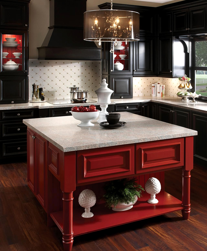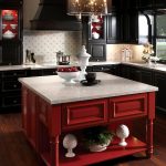 Nasihat berguna! Untuk hitam-dapur merah telah dibunyikan dengan cara yang baru, anda boleh meletakkan alat dengar hitam dengan latar belakang dinding yang dicat dengan warna merah. Gaya dan glamor tambahan akan diberikan oleh candelier dengan loket kristal dan perabot, aksesori dan peralatan bertatahkan kristal.