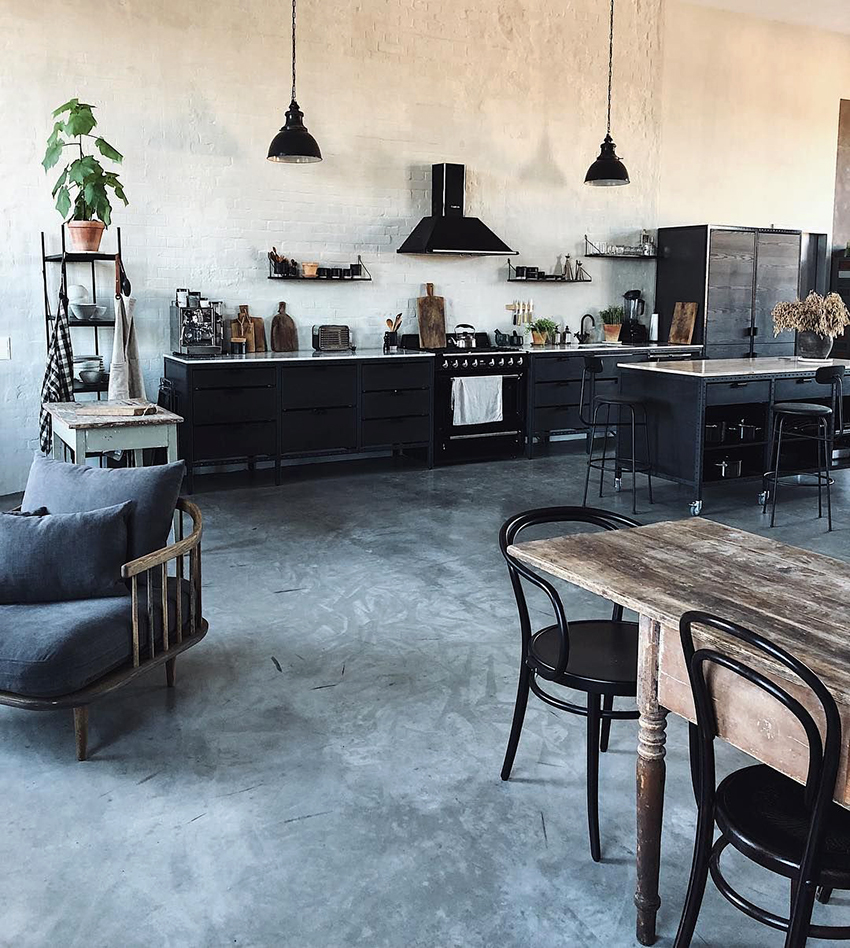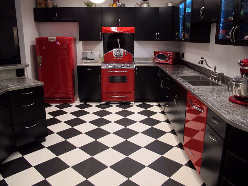 Lantai hitam akan menambah penghormatan dan kos yang tinggi untuk bahagian dalam, tetapi ia akan mengurangkan ruang secara visual. Meliputi warna gelap tidak dapat diterima di dapur kecil, kerana akan mencuri ruang yang sudah hilang. Pada masa yang sama, lantai hitam akan membuat kombinasi yang sangat baik dengan dinding yang dicat dengan warna yang berbeza.