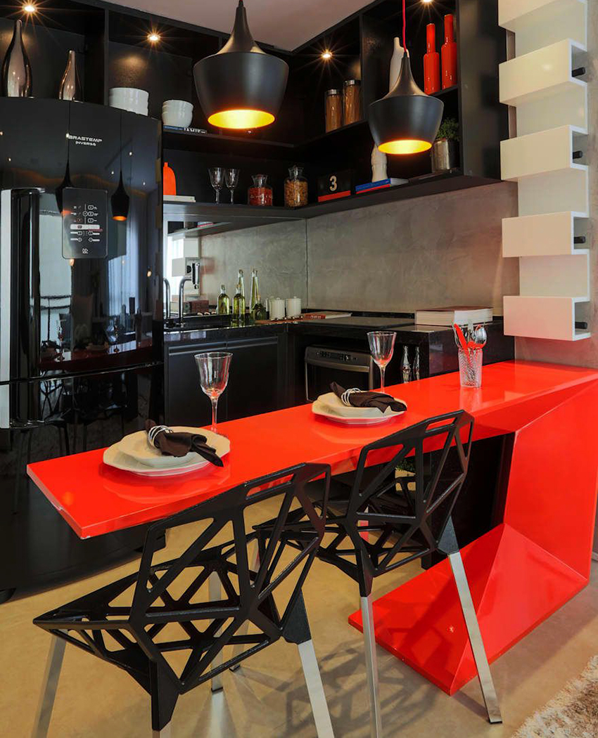 Nasihat berguna! Perincian kaca matte, marmar dan cermin akan membantu melembutkan duo merah dan hitam yang agresif.
