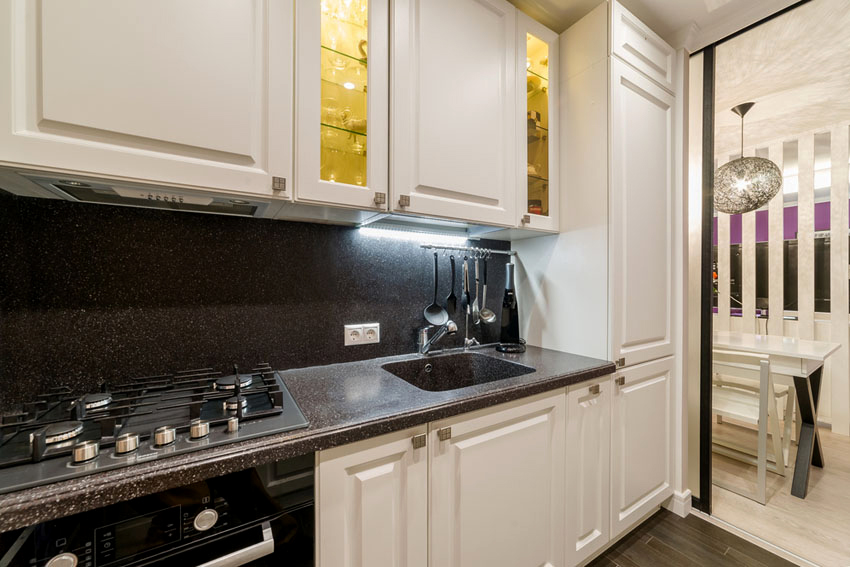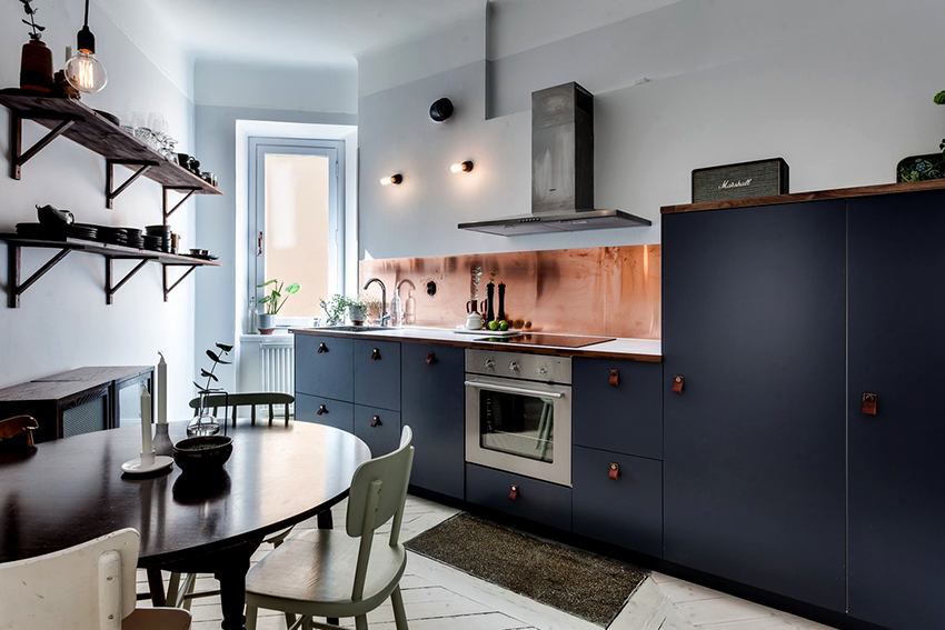 - Nada gelap secara visual mengurangkan ruang, jadi di dapur kecil disarankan untuk memilih warna hitam hanya sebagai aksen.