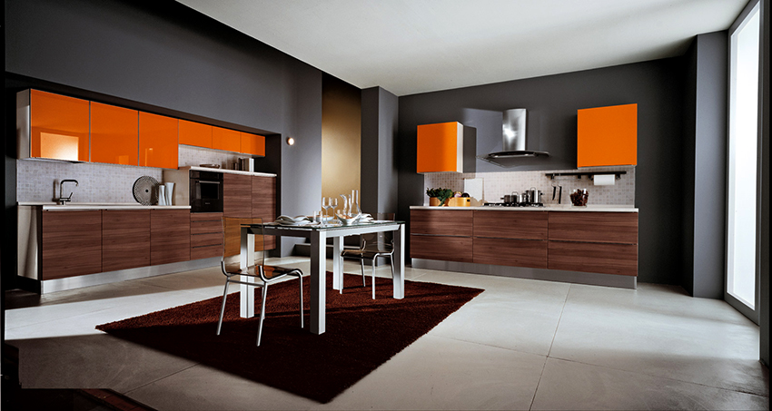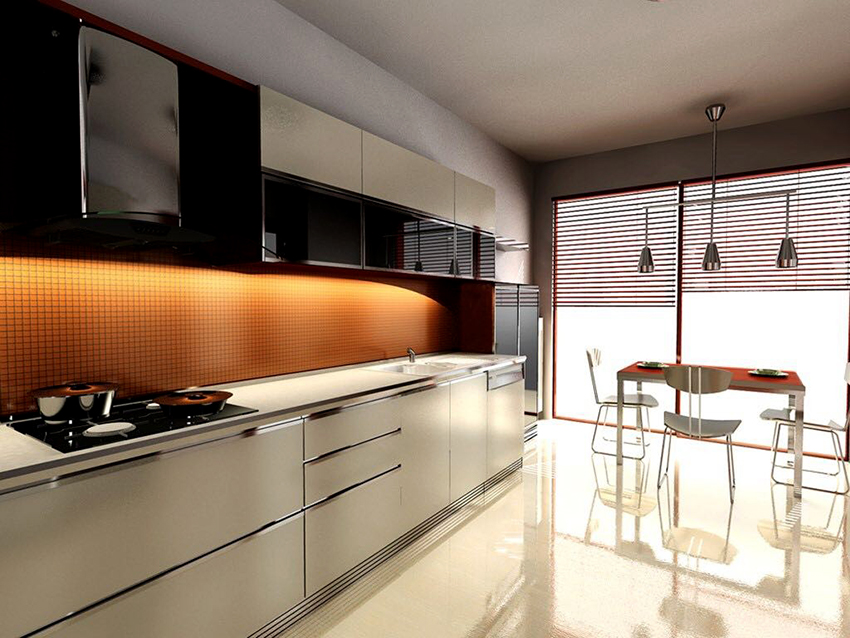 Dekorasi tambahan di dapur ini tidak akan diperlukan. Di sini, laconicism dan kesederhanaan disambut baik dalam segalanya: dalam garis fasad yang jelas dan dalam bentuk kabinet yang ketat. Kelengkapan dipilih paling baik dari keluli berlapis krom.Gabungan tekstur bahan yang berbeza dibenarkan.