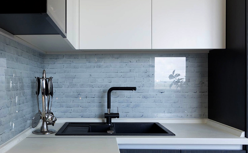 Nasihat berguna! Di dapur berkilat dengan meja hitam, suri rumah disarankan untuk menggunakan serbet mikro di tangan, yang akan mengatasi noda dengan sempurna.