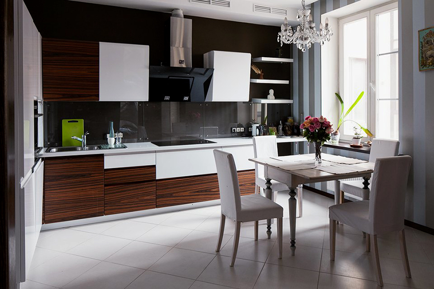 Sekiranya anda menggabungkan dapur putih dengan meja hitam dan apron, maka kesan pelbagai peringkat akan muncul di dalam bilik. Perincian dalaman ini akan menekankan simetri dan keseimbangan, memberikan perabot yang cantik. Pada saat yang sama, meja seperti itu akan menjadi perhatian, jadi ia mesti dijaga dengan bersih. Ini terutama berlaku untuk dapur gloss. Foto menunjukkan dengan jelas kelebihan dan kekurangan reka bentuk ini.