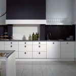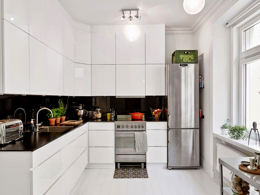 - Putih utama terdapat dalam warna fasad atas, dinding dan siling, dan warna hitam berfungsi sebagai warna fasad bawah, meja dan lantai. Jubin hitam dan putih di dapur akan kelihatan sangat harmoni dalam hiasan apron dan lantai.
