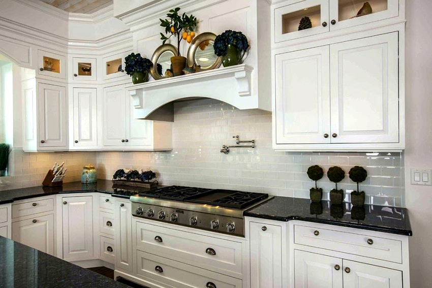 Countertop hitam paling kerap dilengkapi dengan alat dengar putih. Dua warna yang bertentangan akhirnya menjadi padanan yang sempurna. Selalunya, kombinasi seperti itu terdapat dalam gaya seperti klasik moden, art deco, lebih jarang loteng dan barok. Yang paling harmoni adalah bahagian dalam dapur Skandinavia, di mana meja kerja hitam jelas akan membahagi bahagian atas dan bawah kawasan kerja. Di samping itu, kesan ini menyumbang kepada pengembangan dapur secara visual dan menghilangkan rasa kemandulan di bilik putih.