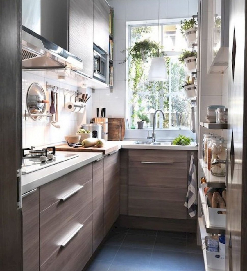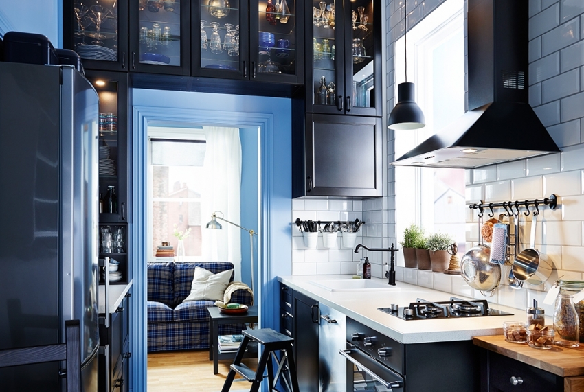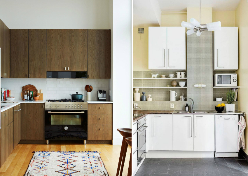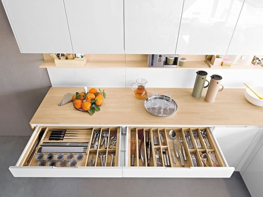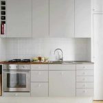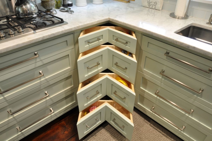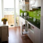 Penyelesaian terbaik untuk masalah kekurangan ruang kosong adalah dengan menggunakan perabot untuk peralatan terpasang. Seperti itu set dapur boleh didapati dalam penjualan atau pesanan pengeluaran individu, yang sebelumnya telah melakukan pengukuran yang tepat. Penting juga untuk memikirkan bagaimana laci dan pintu akan terbuka.