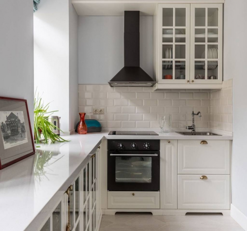 Gaya klasik. Pilihan ini bagus untuk dapur kecil, dengan syarat elemen yang terlalu besar dan besar tidak digunakan. Contohnya, tidak ada ruang untuk bingkai tingkap besar atau candelier. Sebaiknya pilih perabot yang ringkas, dengan reka bentuk yang tidak terlalu megah.