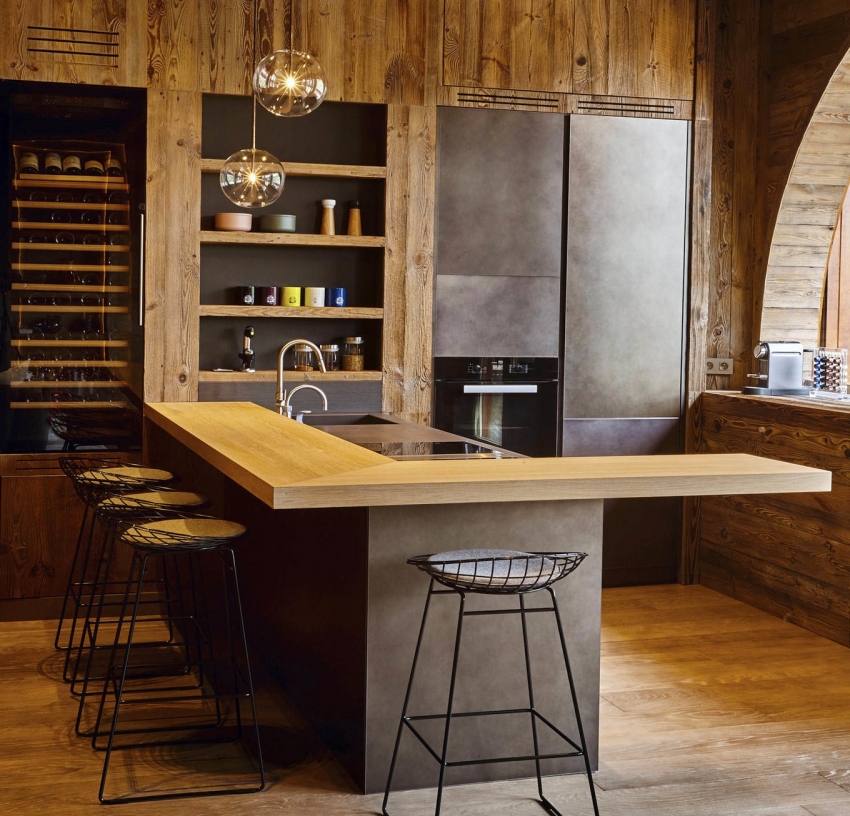 Penyelesaian lain yang bagus untuk mengubahsuai dapur 6 meter adalah memasang kaunter bar dan bukannya tradisional meja dapur... Penyelesaian ini membolehkan anda mengoptimumkan penggunaan ruang, dan pada masa yang sama mempunyai permukaan yang diperlukan untuk makan setiap hari.