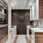 Satu lagi pilihan tempat penginapan yang menarik perabot di dapur kecil - susun atur dua baris. Dalam kes ini, perabot terletak di sepanjang dinding yang bertentangan, yang paling sering membaginya dengan tujuan: di satu pihak, mereka menempati permukaan untuk memasak, dan di sisi lain, terdapat kawasan makan dan rekreasi.