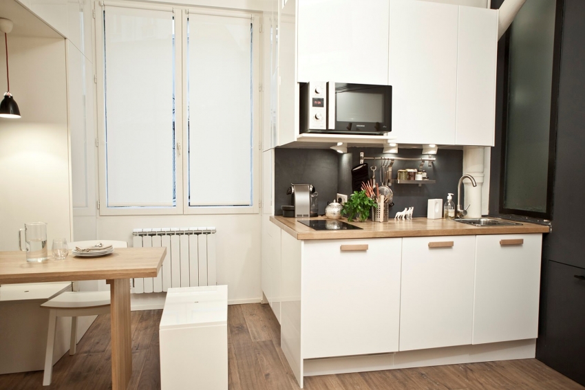 - dalam susunan dapur kecil, sistem penarik moden akan membantu, dan juga lipatan meja.