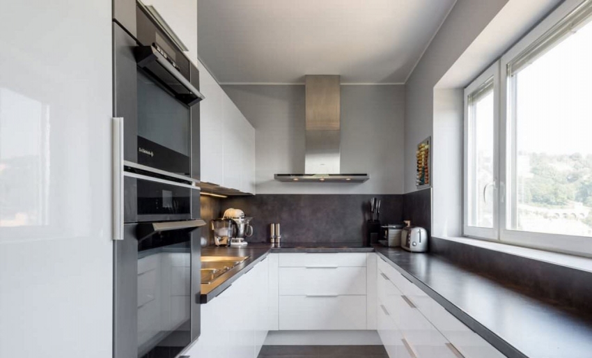 Susunan set dapur berbentuk U juga dapat digunakan dengan berkesan. Dalam kes ini, semua perabot yang diperlukan diletakkan di atas tiga dinding, yang, di satu pihak, mengurangkan jumlah ruang bebas untuk bergerak, tetapi di sisi lain, meningkatkan permukaan kerja. Dengan susun atur seperti itu, dapur dapat menampung jumlah maksimum peralatan rumah tangga kecil serta piring.