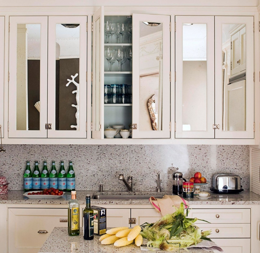 Penggunaan cermin dan perabot kaca secara visual meringankan ruang yang kecil dapur di Khrushchev