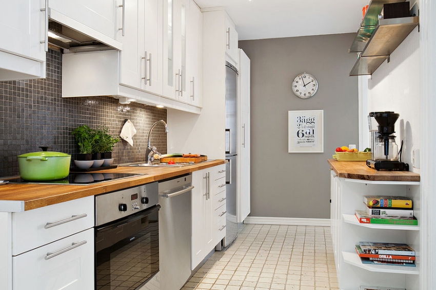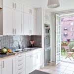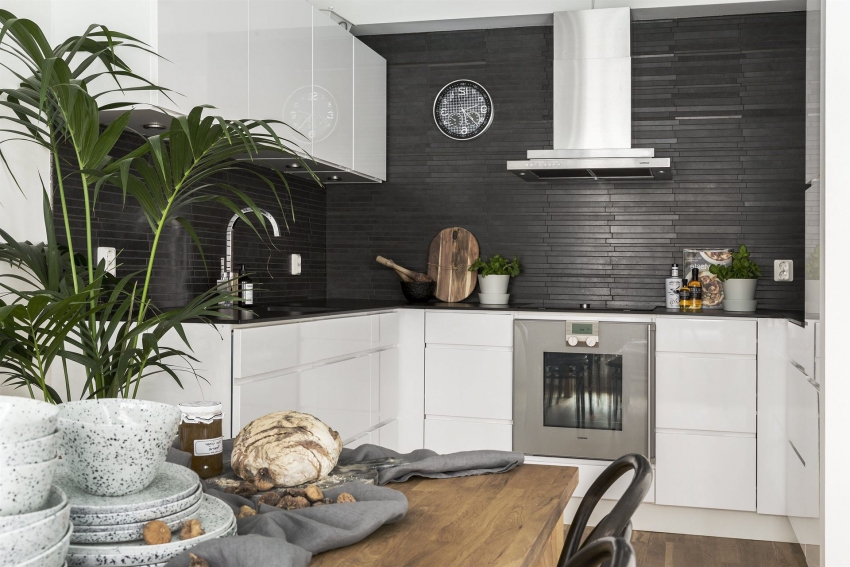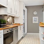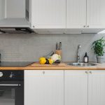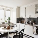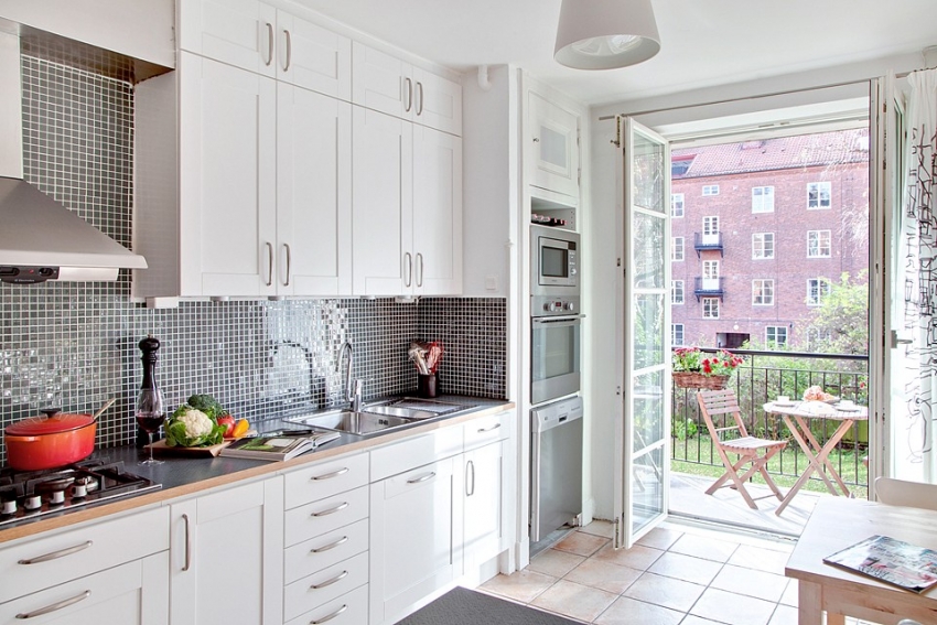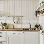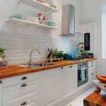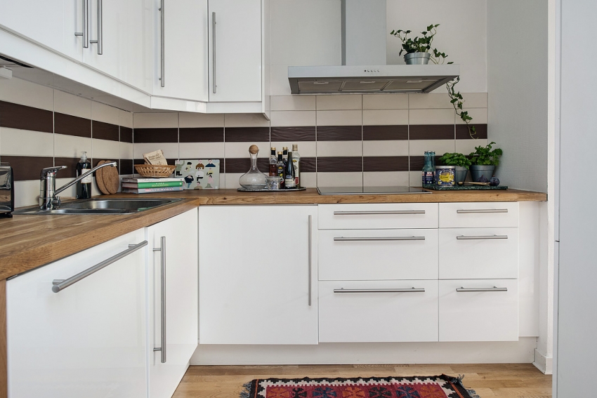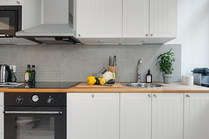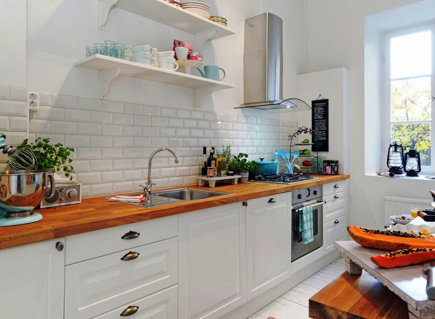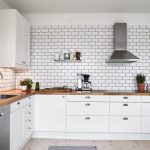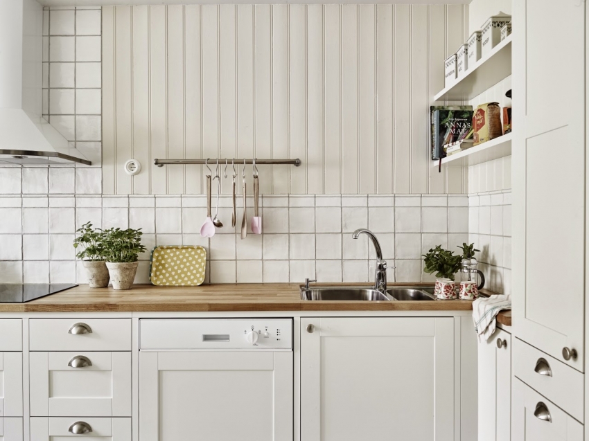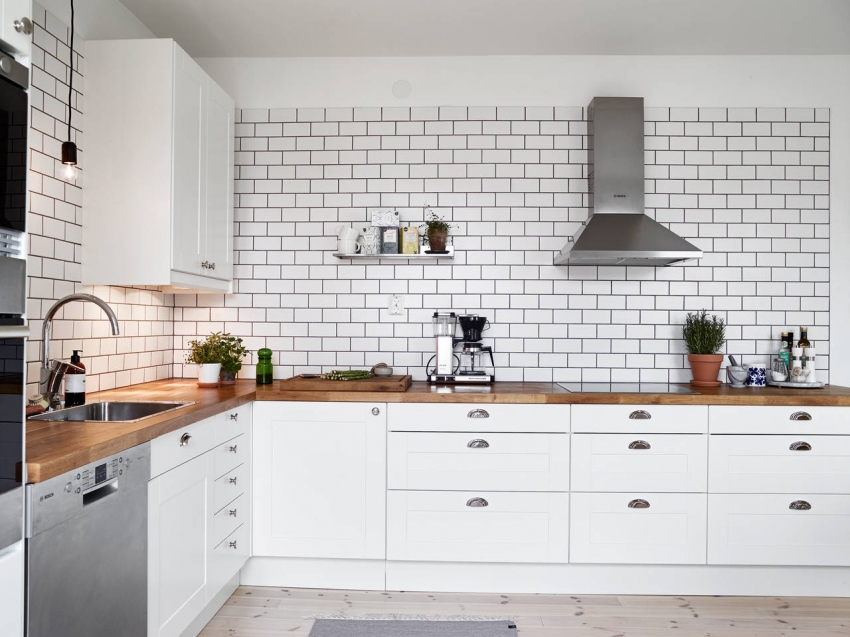 Jubin putih persegi sering digunakan untuk hiasan apron Dapur gaya Scandinavia