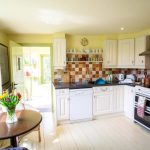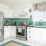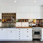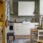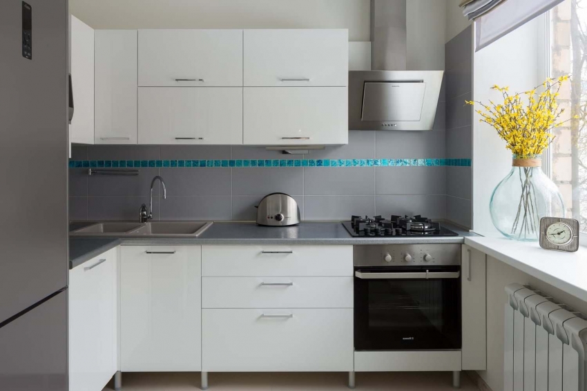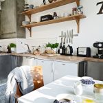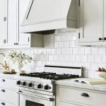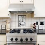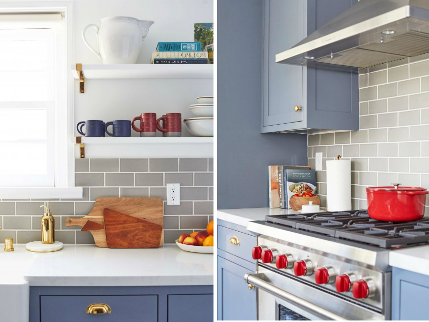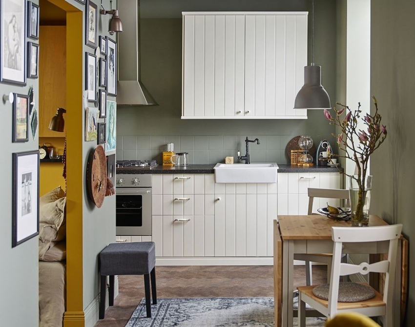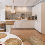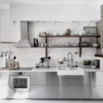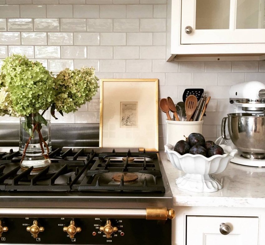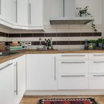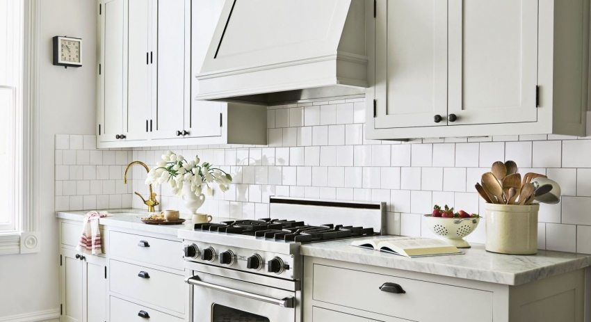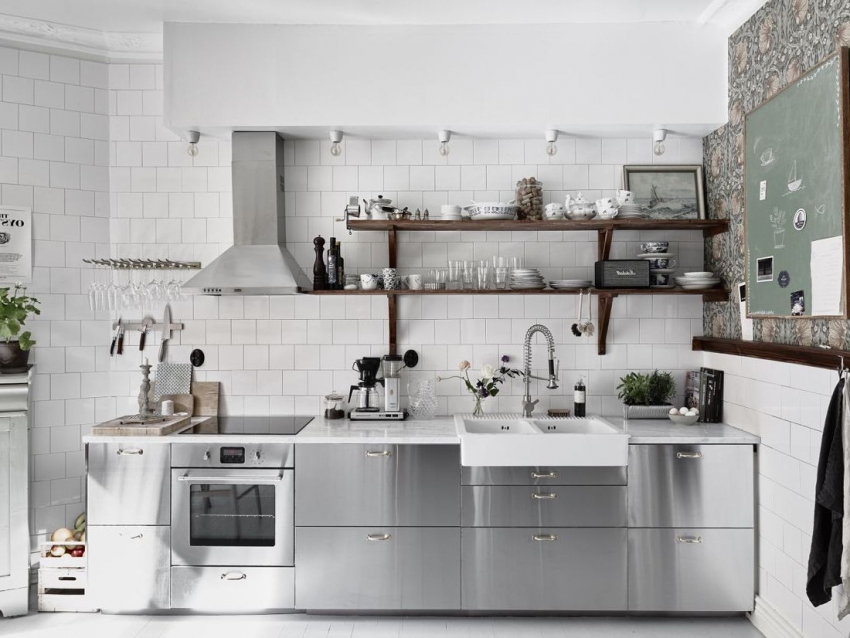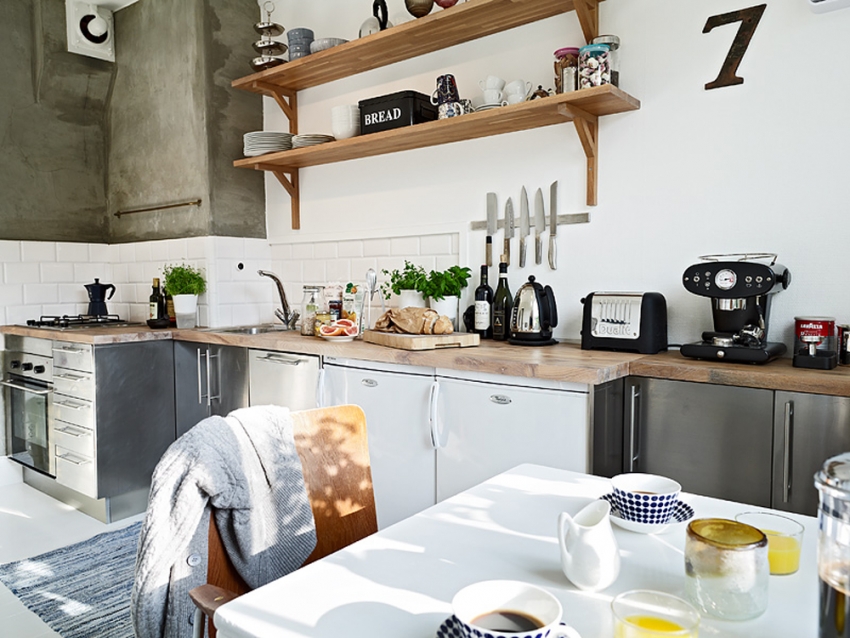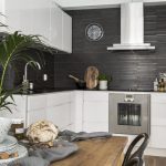 Jubin putih persegi sering digunakan untuk hiasan apron Dapur gaya Scandinavia