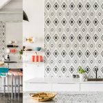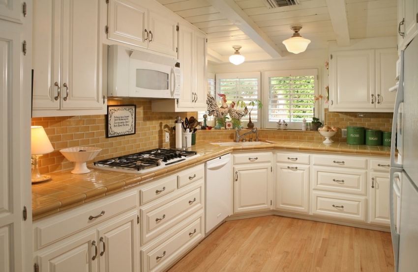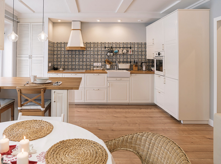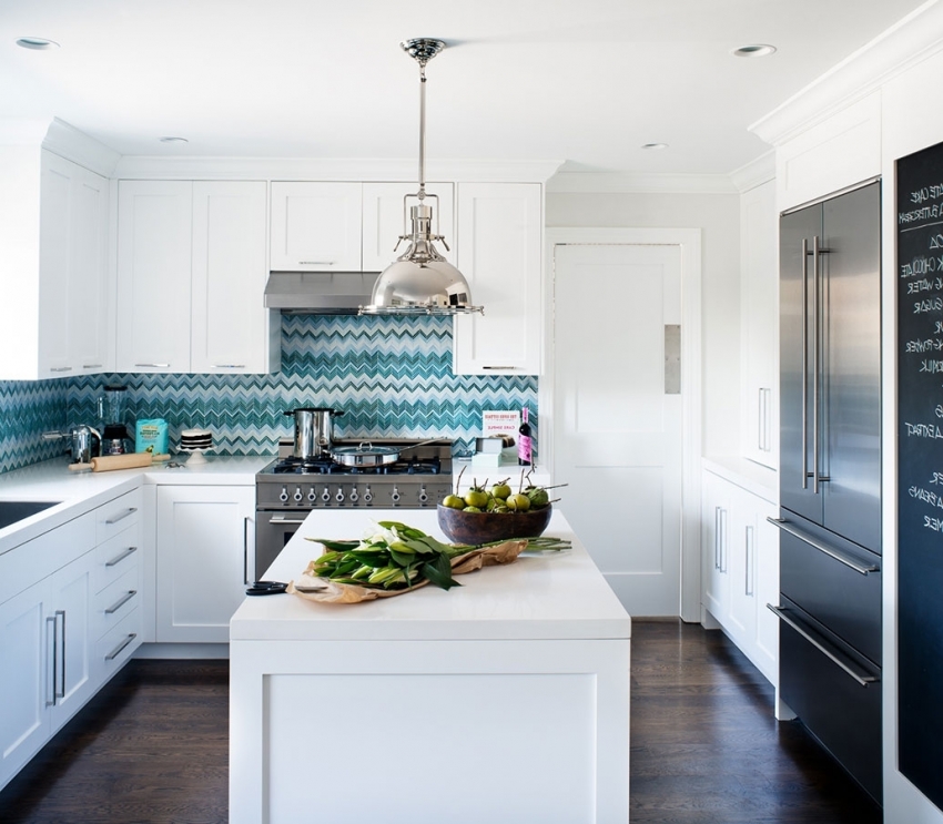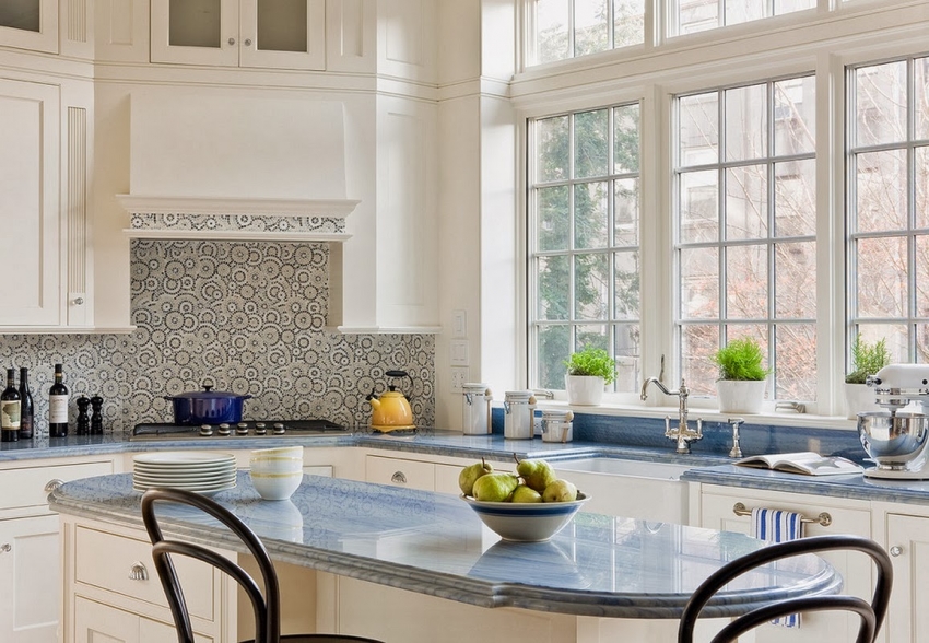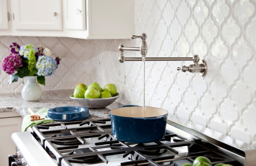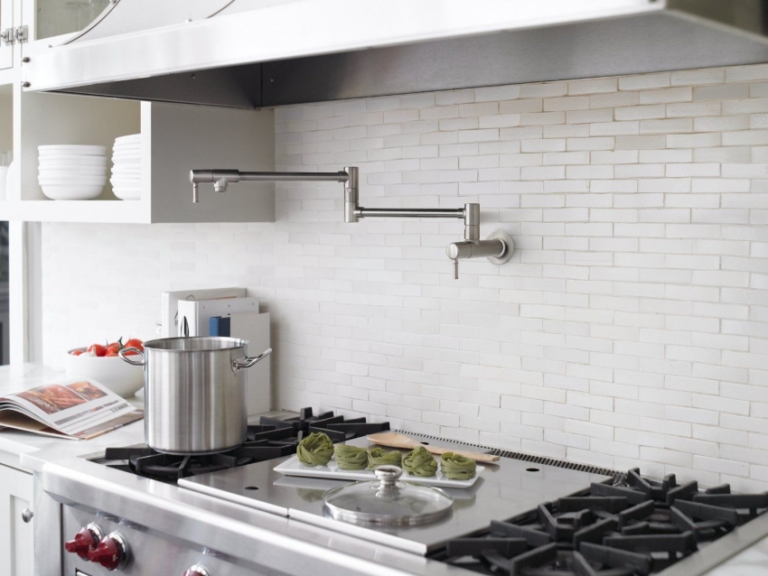 Untuk klasik dapur putih anda boleh menggunakan jubin dengan hiasan yang menarik, yang akan menjadikan dalaman lebih moden