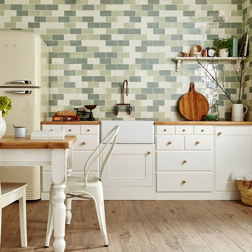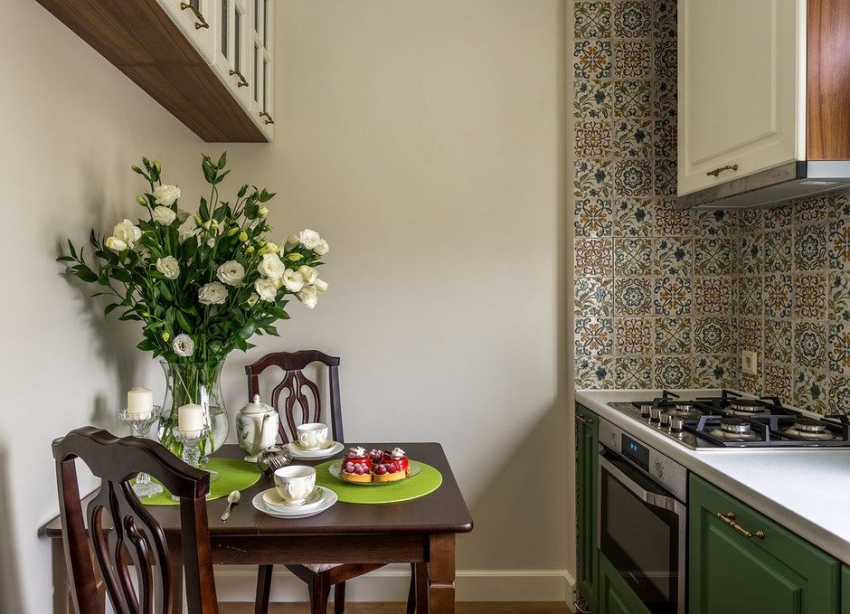 Jubin kecil seperti itu kelihatan hebat di dapur kecil, mengembang secara visual dan bukannya memenuhi ruang. Di samping itu, jika unit dapur kecil, jubin seperti itu akan kelihatan organik dan semula jadi mungkin.