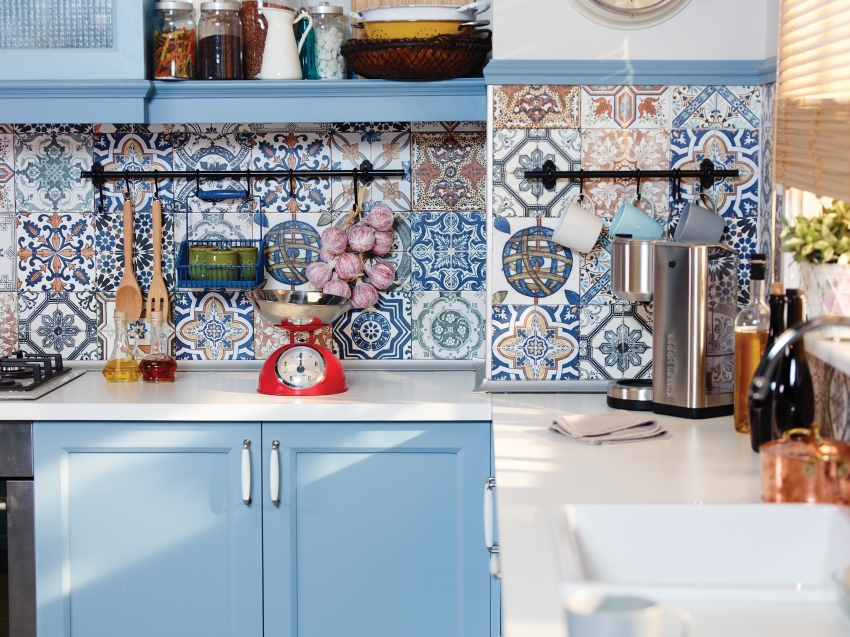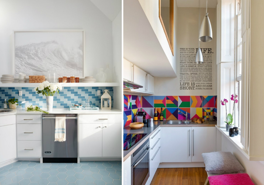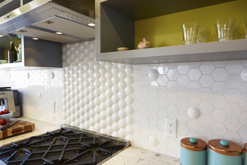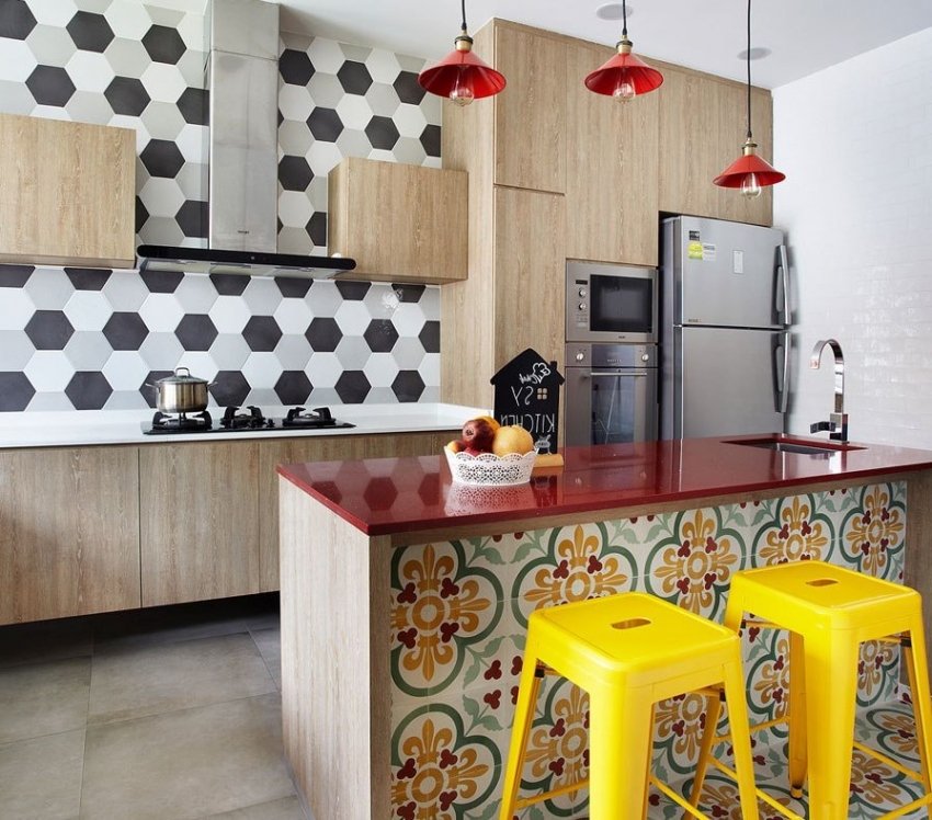 Jubin seramik dengan warna yang berbeza dapat digabungkan antara satu sama lain, membuat hiasan menarik di apron