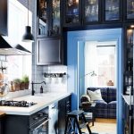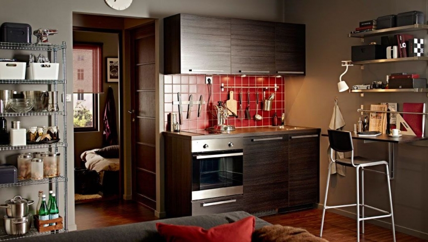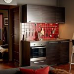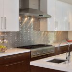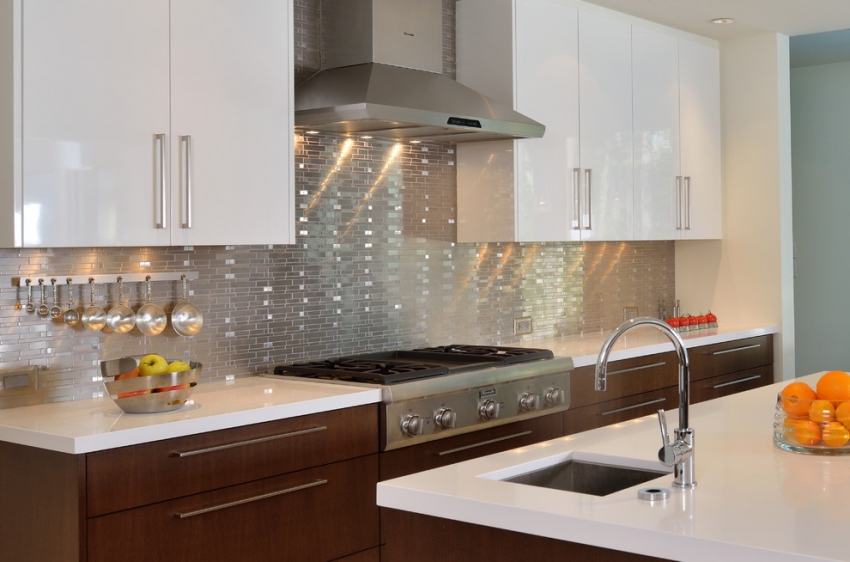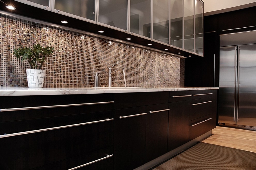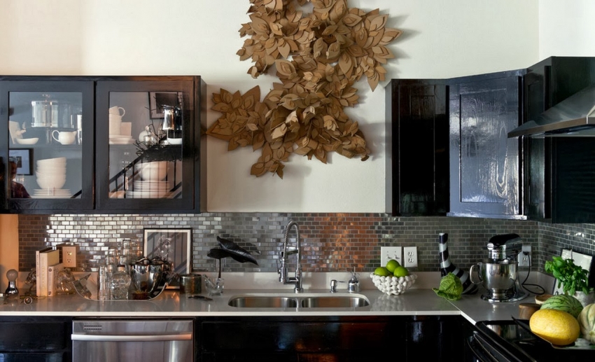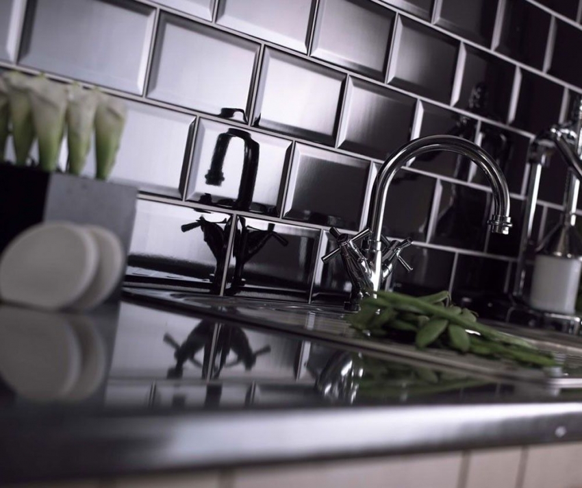 Menggunakan jubin cermin untuk apron membolehkan anda memperluas ruang dapur secara visual
