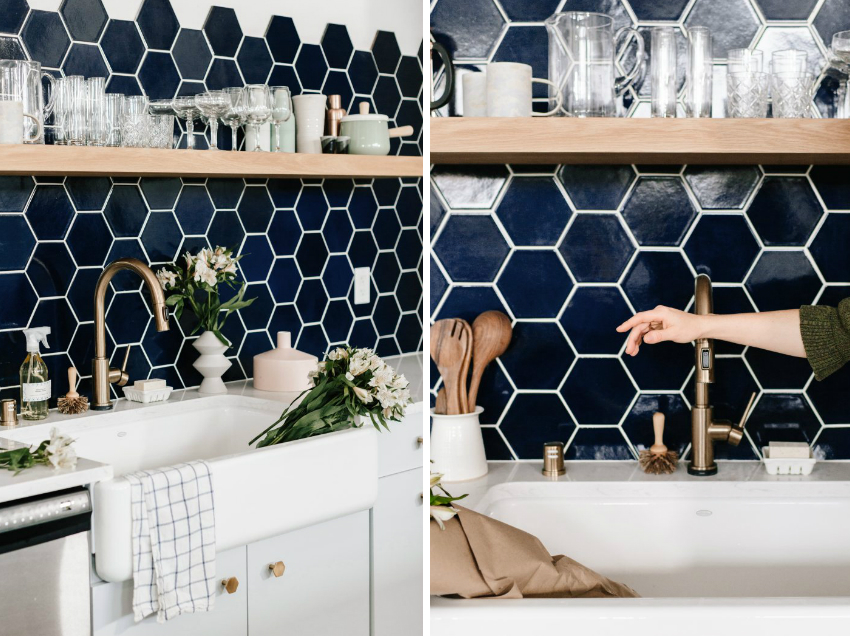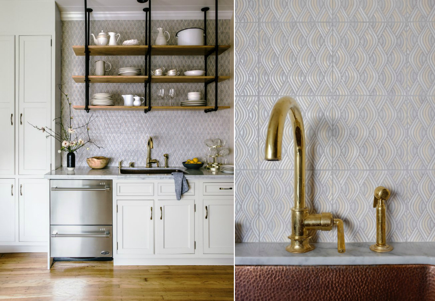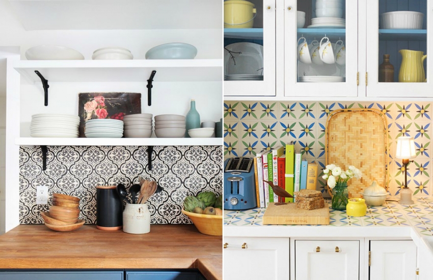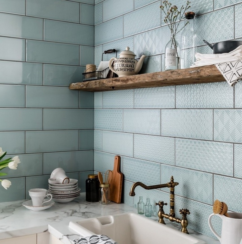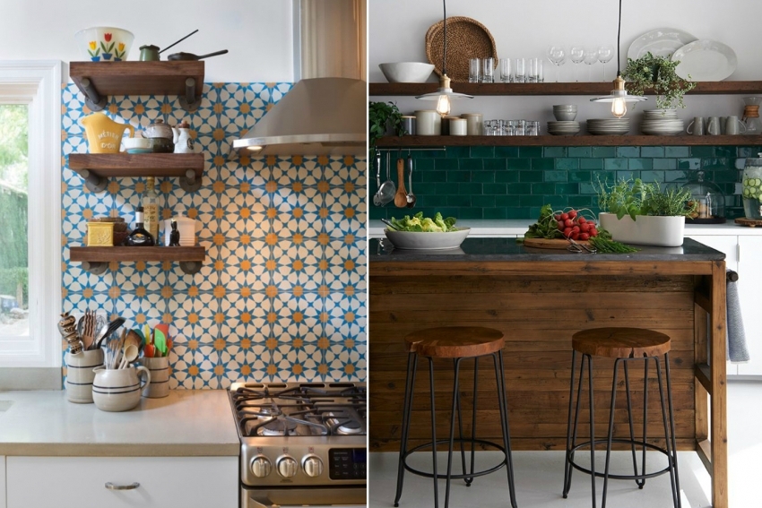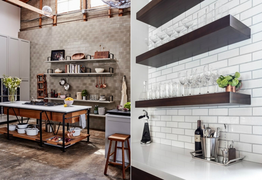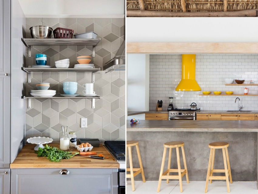 Semasa pendaftaran dapur apron dengan rak terbuka, jubin dengan corak atau bentuk yang menarik harus digunakan