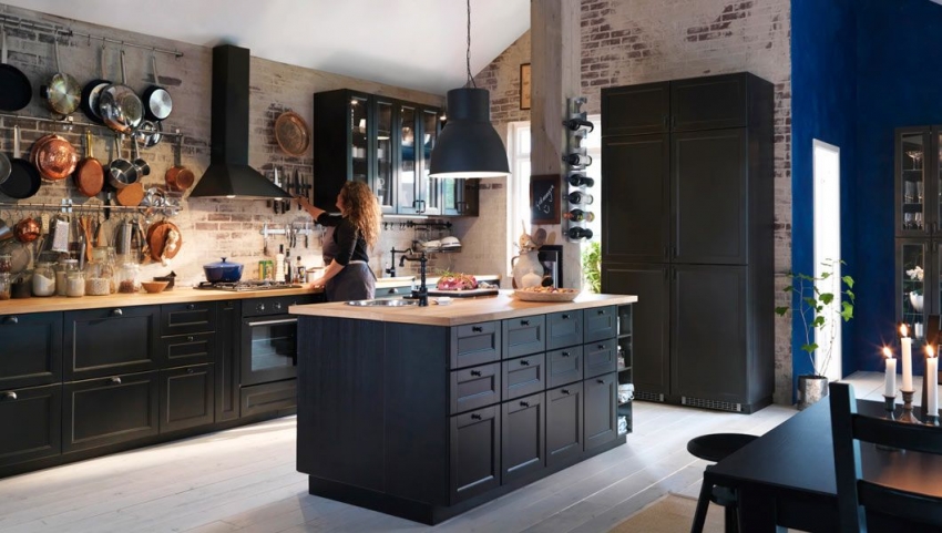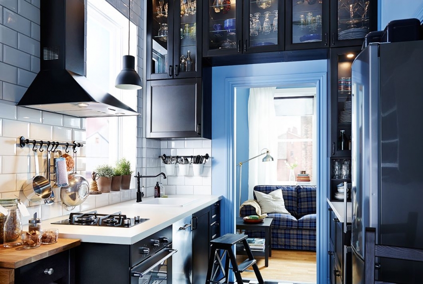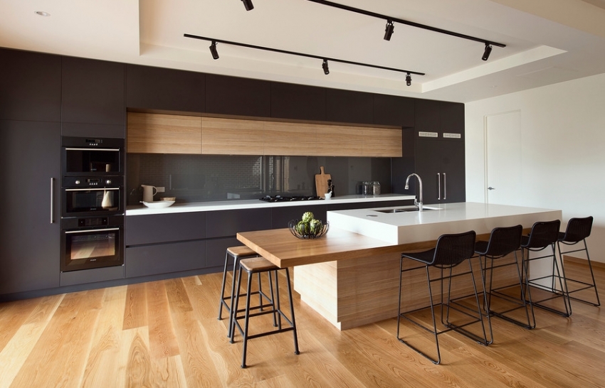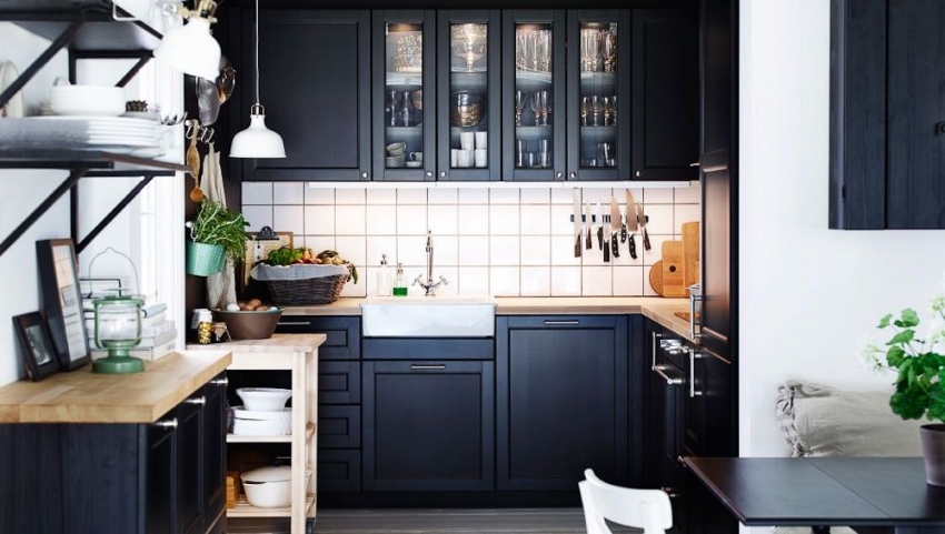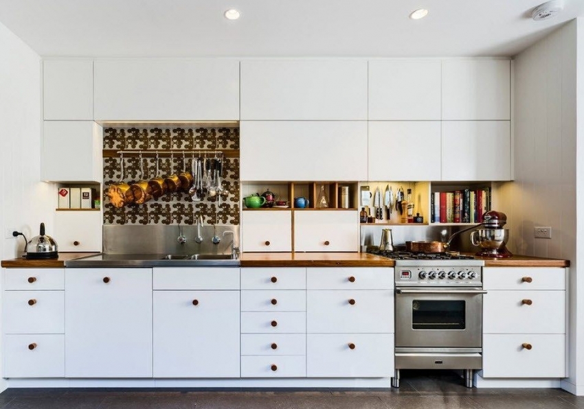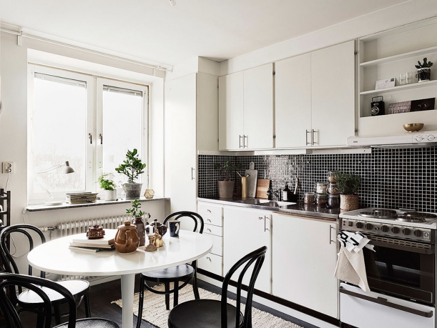 Nasihat berguna!Di bahagian dalam klasik, walaupun jubin hitam dapat digunakan untuk apron dapur, namun teknik ini hanya dibenarkan di bilik yang luas. Di dapur kecil, lebih baik tidak menggunakan elemen gelap seperti itu.