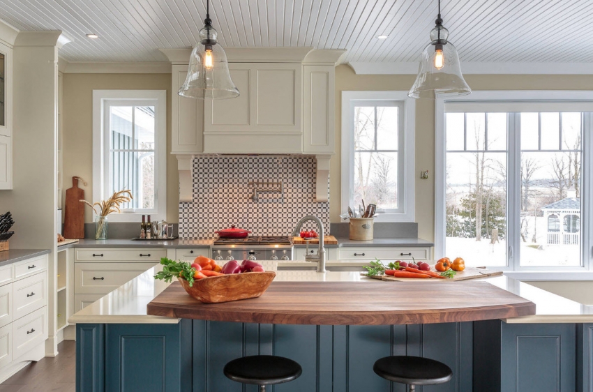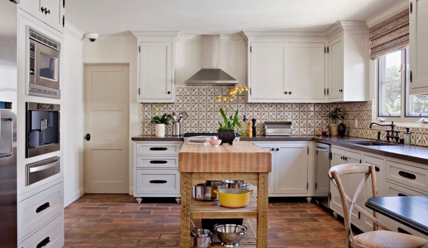 Sempadan jubin Merupakan elemen reka bentuk dapur gaya negara klasik. Dalam kes ini, tepi apron atas dan bawah disusun dengan jubin bujur, sehingga menguraikan batasnya. Jalur jubin bujur yang sama, dilancarkan di tengah, juga kelihatan hebat.