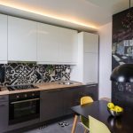 Penggunaan warna monokrom jubin seramik untuk hiasan dapur memerlukan aksen dan aksesori yang terang di pedalaman.
