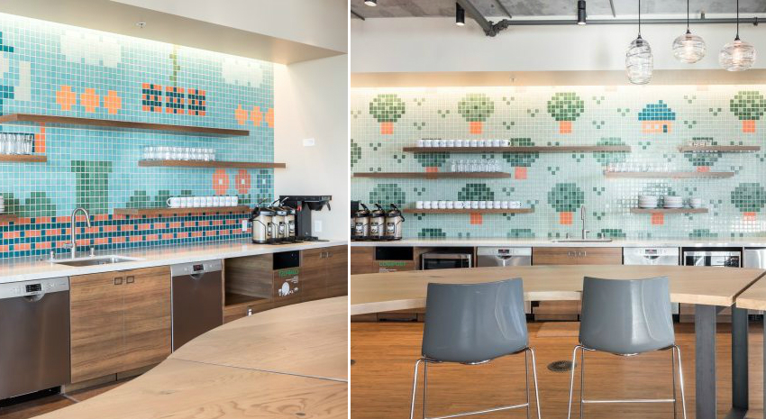 Kelebihan lain dari penyelesaian ini adalah kesederhanaan pelapisan di tempat yang sukar dijangkau. Di samping itu, elemen kecil seperti itu dapat digabungkan dengan sempurna dengan bahan penamat yang lain. Betul, ada beberapa kesulitan, misalnya, untuk meletakkan jubin seperti itu dengan kualiti yang tinggi, pengalaman dan kemahiran tertentu akan diperlukan, kerana akan ada lebih banyak sambungan daripada pada meletakkan jubin dengan ukuran standard.