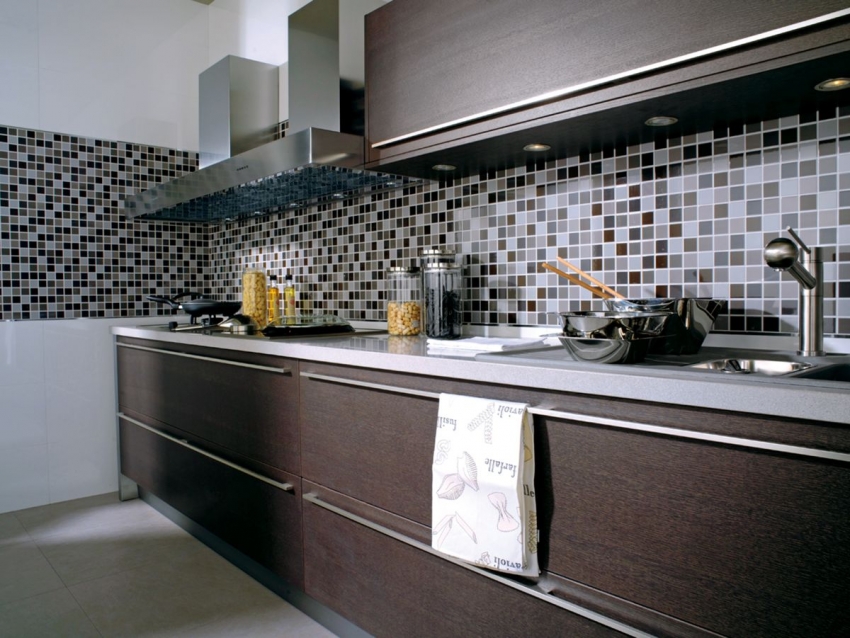 Idea yang bagus adalah menggunakan mozek, ukuran elemennya 5x5 cm. Segmen seperti itu tidak akan terlalu kecil, tetapi pada masa yang sama mereka akan memberi suasana dalaman. Anda boleh mengesahkannya dengan melihat foto apron untuk dapur yang diperbuat daripada jubin seramik.