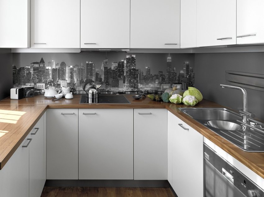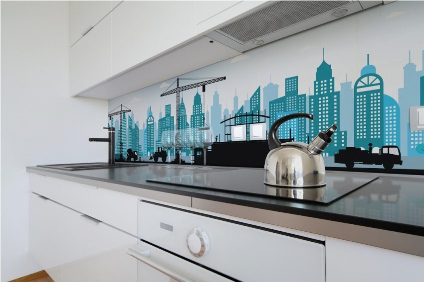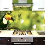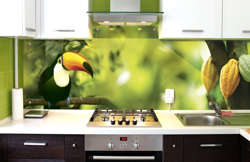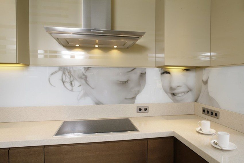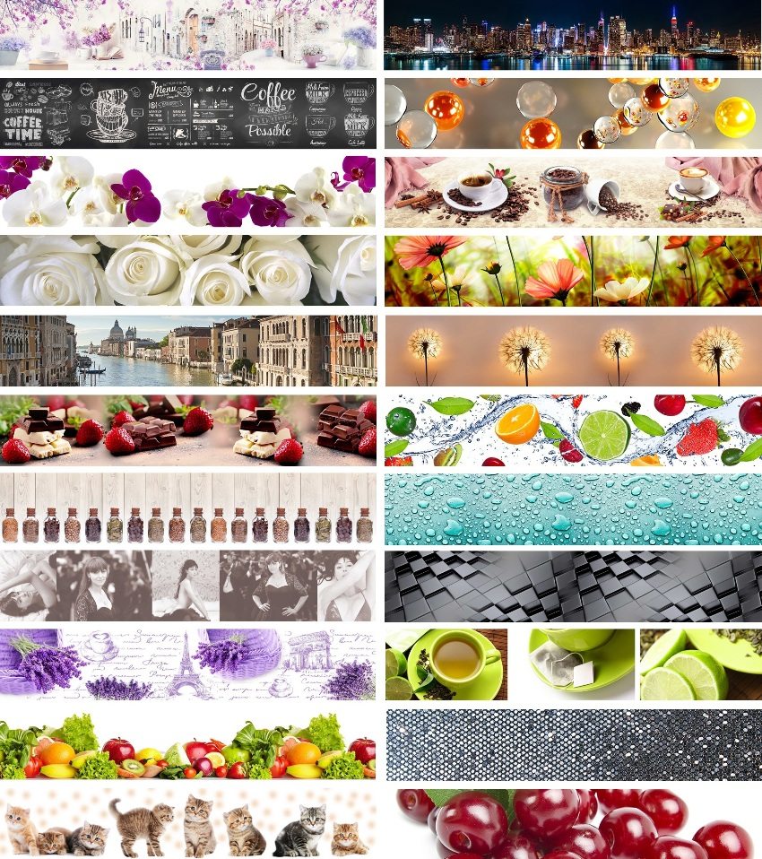 - Anda boleh memilih gambar apa sahaja untuk kulit. Contoh dan gambar apron kaca, percetakan foto untuk dapur, anda boleh melihat laman web khusus.