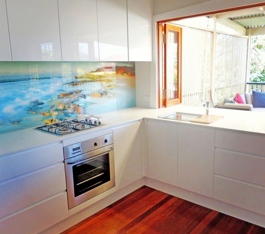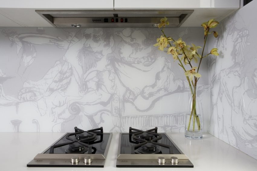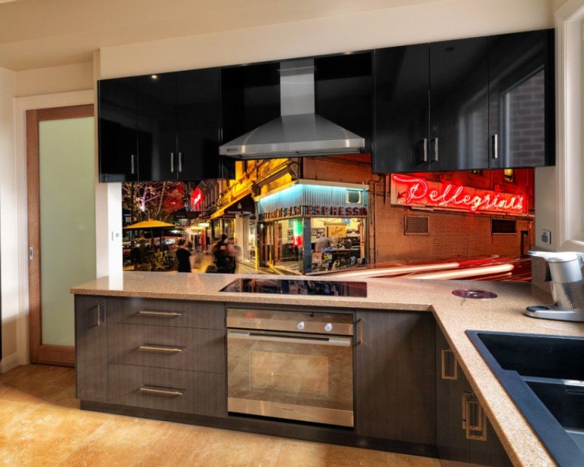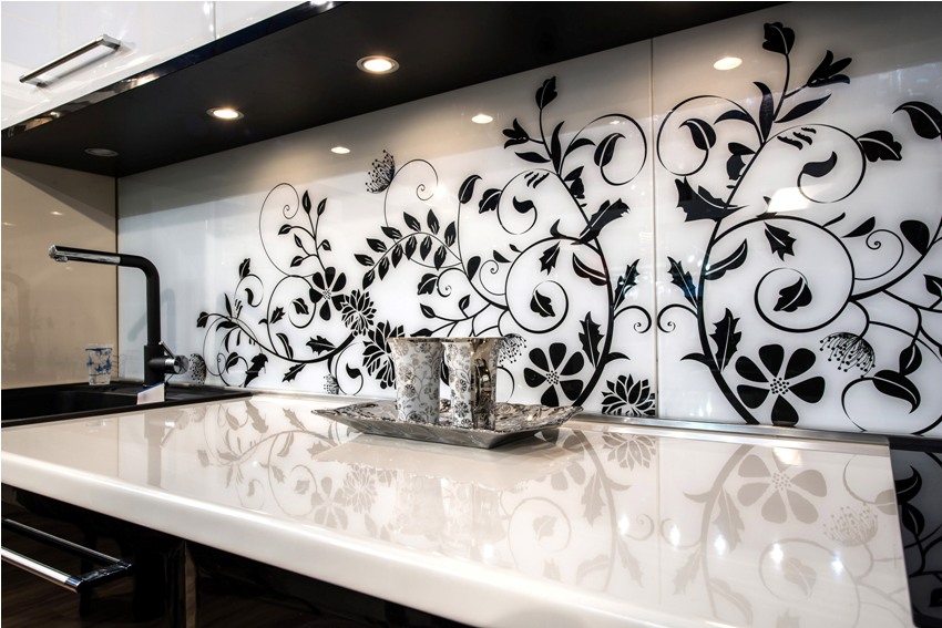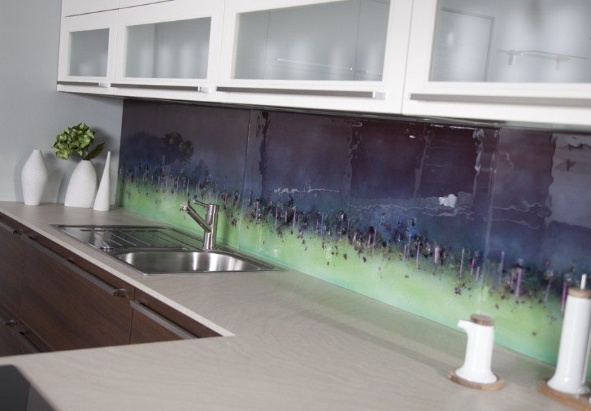 - apron dapur kaca adalah medan besar untuk imaginasi anda. Terima kasih kepada teknologi moden, anda boleh menghiasnya dengan pencetakan foto dan stereo, memesan substrat khas (baik yang biasa dan dengan cetakan) atau membuat lukisan pasir di permukaan. Foto apron dapur kaca menunjukkan ini dengan sempurna;