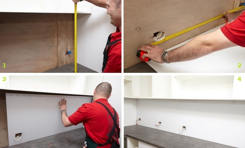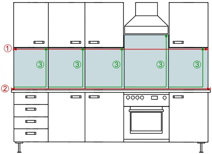 Arahan untuk pengukuran yang betul: 1 - lebar apron di sepanjang garis bawah kabinet gantung; 2 - lebar apron di sepanjang garis atas alas bawah; 3 - ketinggian apron pada titik pelepasan yang berbeza antara perabot
