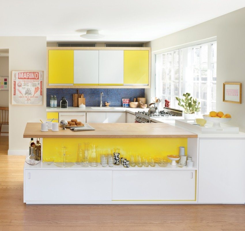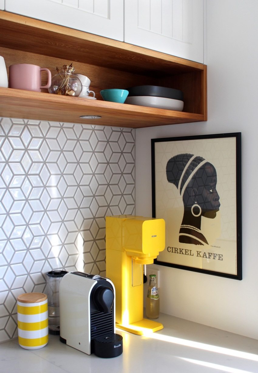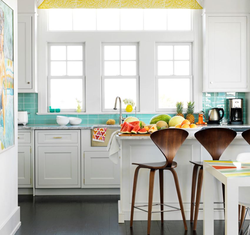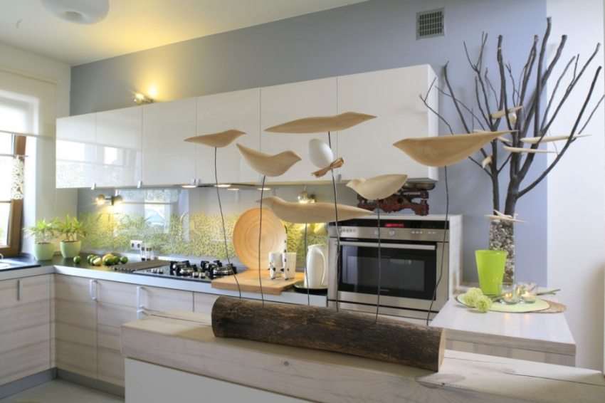 Nasihat berguna! Pereka dalaman mengesyorkan agar tidak menggunakan gambar dengan lebih dari tiga warna - ini menimbulkan rasa tidak selesa di dapur.