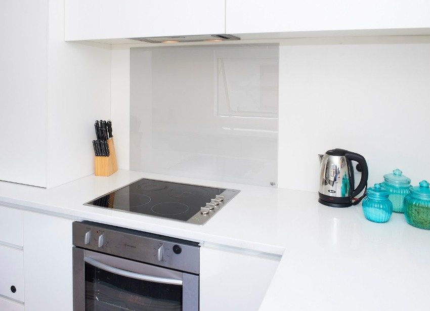 Kekurangan apron kaca di dapur: contoh penggunaan foto