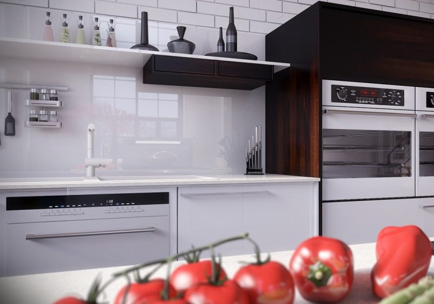 - 1.3 Celemek untuk dapur, berkulit: foto pilihan reka bentuk panel kaca