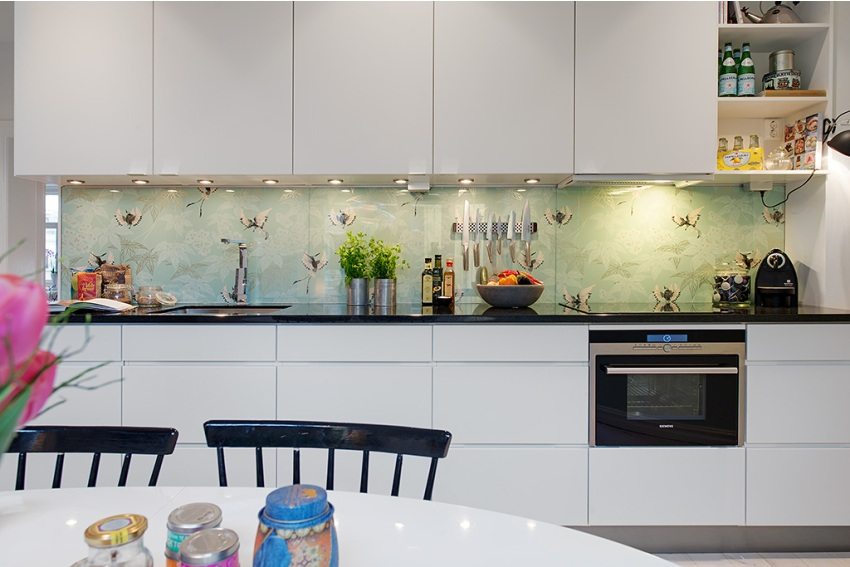 - kaca membolehkan anda menerapkan idea anda sendiri dalam reka bentuk dapur, sebagai contoh, anda boleh memasukkan kolaj foto keluarga anda atau resipi yang dicetak dengan indah di bawah kaca;