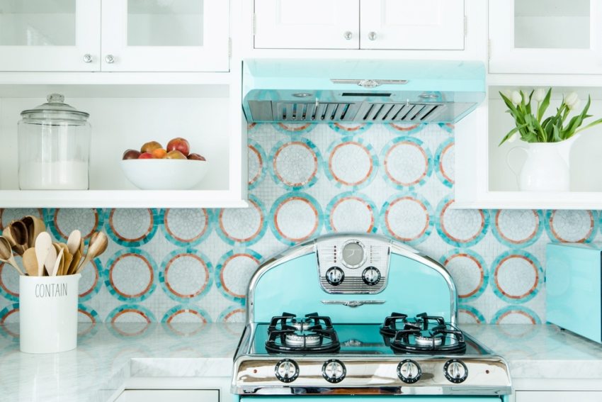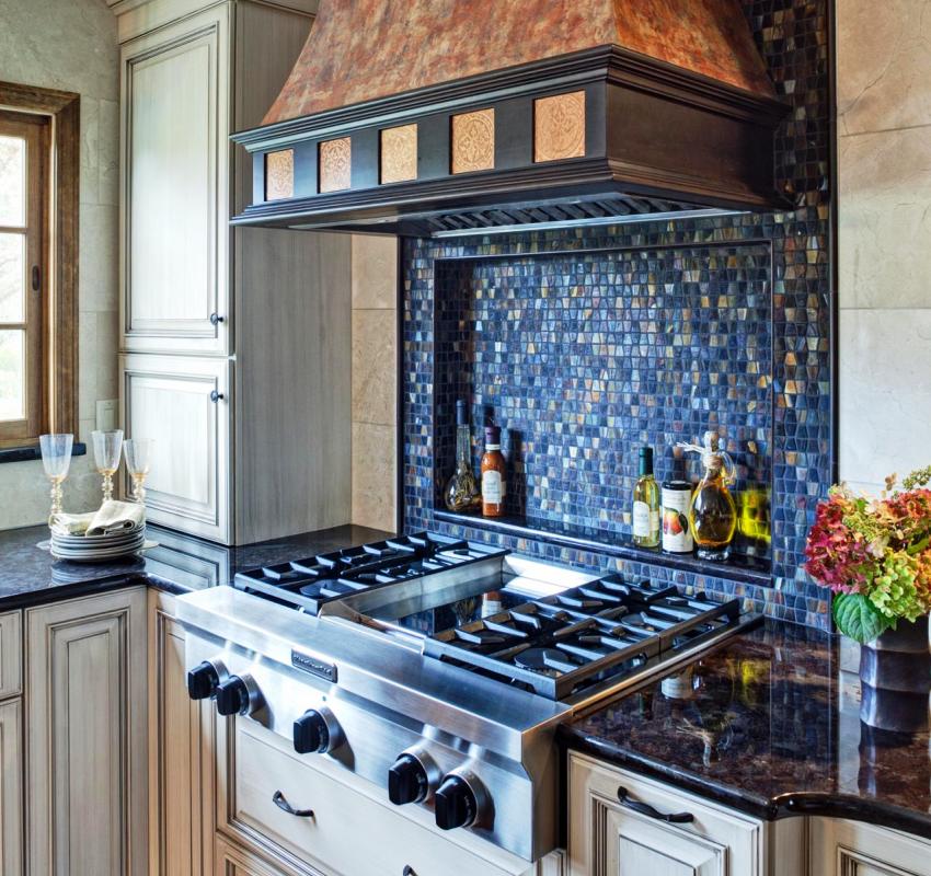 Niche di atas dapur gas berjubin dengan mozek biru