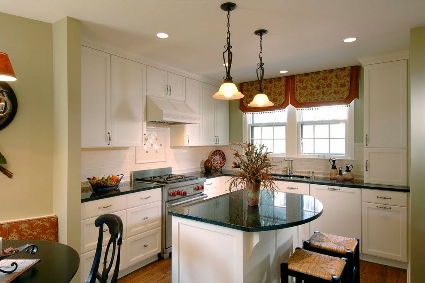Nasihat berguna! Pulau dapur tidak harus berbentuk persegi atau segi empat tepat. Bentuknya bergantung pada ciri konfigurasi dapur dan kehendak chef keluarga ketua.