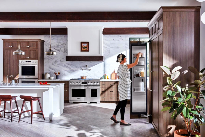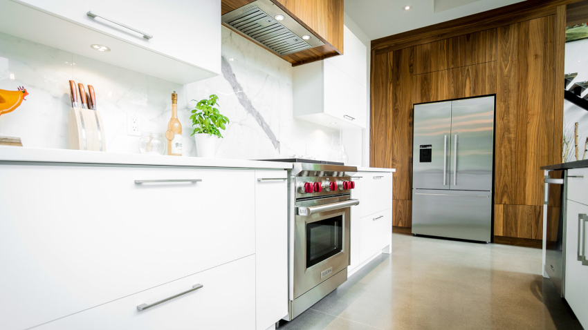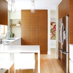 - Sebaiknya letakkan peti sejuk di sudut dapur, dan anda tidak boleh membelah permukaan kerja menjadi kawasan kecil. Dan anda juga perlu menyediakan ruang yang cukup untuk membuka pintu, yang seharusnya tidak menghalang jalan keluar dari dapur.