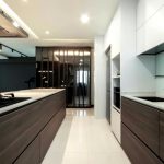 Dalam foto idea untuk ruang dalaman dapur dengan luas 14 meter persegi. meter dan lebih banyak, susun atur selari atau dua baris lebih biasa, yang paling sesuai untuk dapur yang luas, terutama untuk yang digunakan sebagai bilik berjalan kaki. Dalam kes ini, sink dan kompor diletakkan di sepanjang salah satu dinding, sementara peti sejuk dan perabot diletakkan di sepanjang dinding selari yang lain. Kelebihan utama dalaman seperti ini adalah kemampuan untuk memasang pelbagai peralatan, tetapi kelemahan ketara dari susun atur selari adalah kerumitan mengatur lokasi yang selesa untuk kumpulan makan.