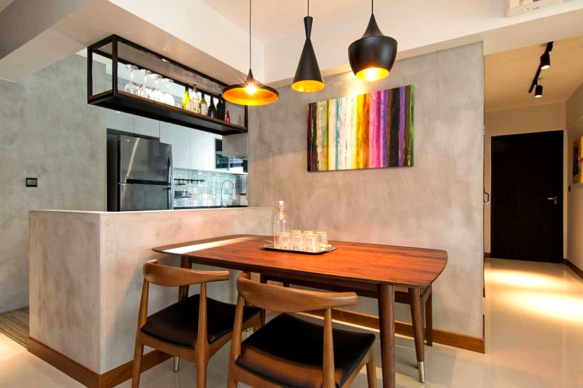 Selalunya, dapur di pangsapuri bujang digunakan sebagai tempat berkumpul dengan rakan-rakan, apabila anda tidak perlu memasak sebilangan besar hidangan. Selain itu, pemilik, yang menghabiskan sebahagian besar hari di tempat kerja, tidak akan mempunyai masa untuk memasak di sini. Dalam kes ini, lebih baik melengkapkan dapur dengan gaya minimalis, apabila hanya barang keperluan yang ada di dalam bilik.