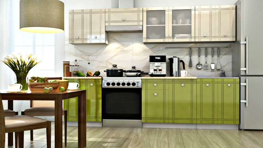 Terdapat pilihan untuk pembuatan dapur dengan fasad plastik, yang terpaku pada papan serpai atau MDF. Dalam kes ini, anda boleh membuat pelbagai reka bentuk, sementara permukaan plastik paling tahan terhadap pudar dan deterjen. Baru-baru ini, pereka sering menggabungkan profil aluminium dengan plastik, kayu, jubin seramik atau sisipan kaca. Perlu diingat bahawa aluminium boleh menjadi gelap. Di dapur kecil, sangat penting untuk menggunakan elemen kaca yang menjadikan bahagian dalam lebih ringan dan tidak mengganggu.