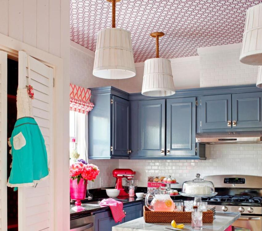 Kaedah lain yang murah untuk menghias siling di dapur adalah dengan meletakkannya. Dalam kes ini, anda dapat mempercepat proses pembaikan dengan ketara dan mengelakkan munculnya retakan kecil yang terbentuk semasa penyusutan, yang berjaya disembunyikan di bawah kertas dinding. Akan diterima kertas dinding bersalut yang boleh dicuci dan sifat tahan kelembapan. Mereka akan menyembunyikan semua kecacatan siling dan memberikan ketahanan visual pada lapisan.